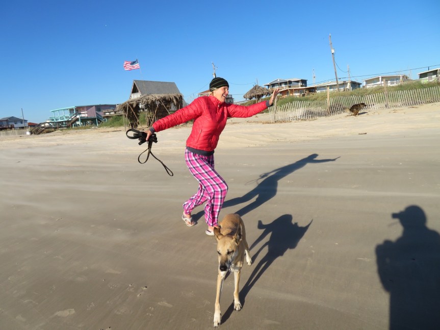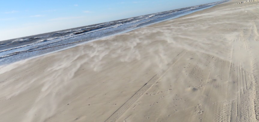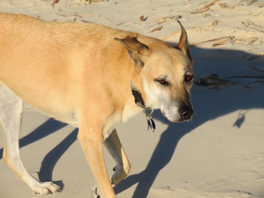 Took the dogs for a walk out on the beach. The wind was blowing low swirling clouds of sand along the hard packed beach. The dogs were being buffeted making Cali’s ears stand up and Koda’s tail was waving in the breeze.