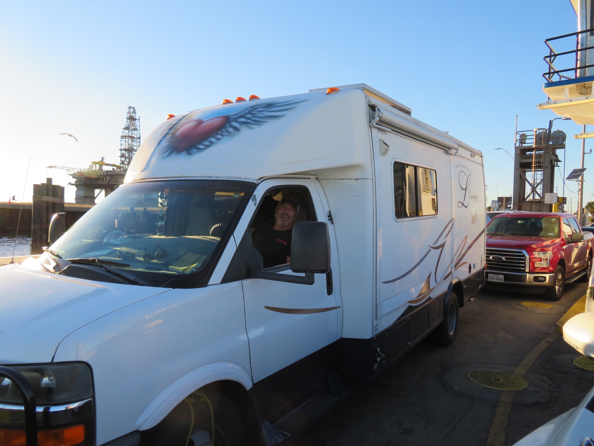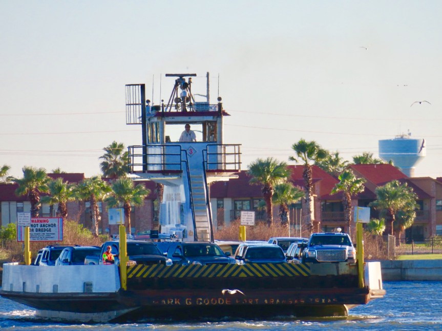 We didn’t realize that we had to take yet another ferry to cross over to Port Aransas. There was a 1/2 hour wait in a long queue of cars to get on one of the three small boats they had running today.
