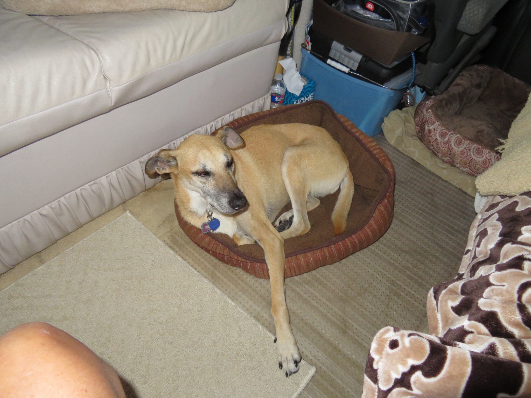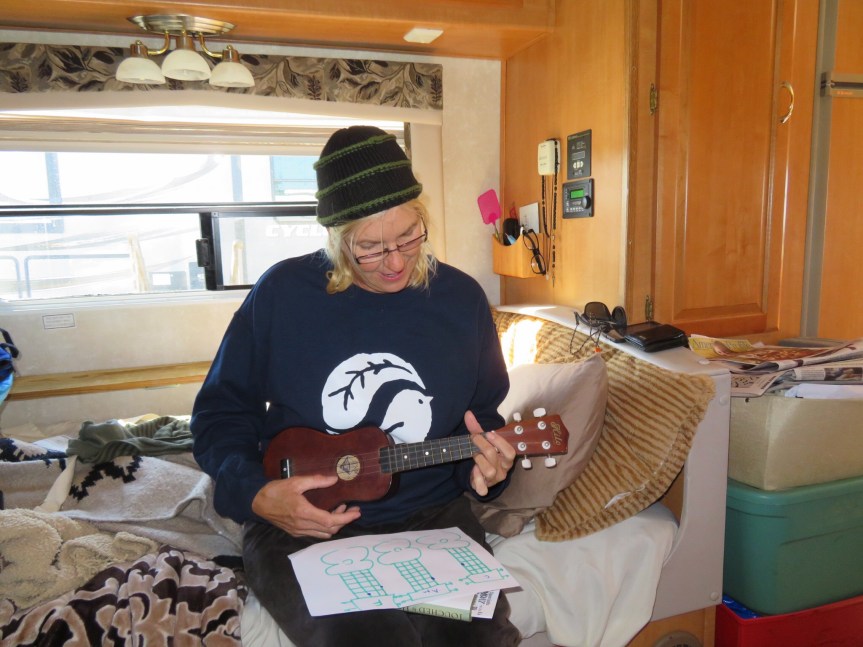 I got out a mat and crawled around underneath the RV, checking all the bolts and connections to make sure nothing was loose and needed attention. After filling the gas tank, the residual smell of gas stays in the bathroom and pantry area. There is never any leakage on the ground, so I checked the fittings and hose going to the tank from the filler opening. The hose looks a little dry and is now on my list of things to replace when we stop for a day or two. The other thing I noticed was one of the sensor wires that lets you know where the poo level is at was broken. That explains why the gauge hasn’t been working. All of my electrical stuff is buried in the closet, so this is put off until Mazatlan as well.