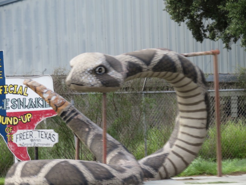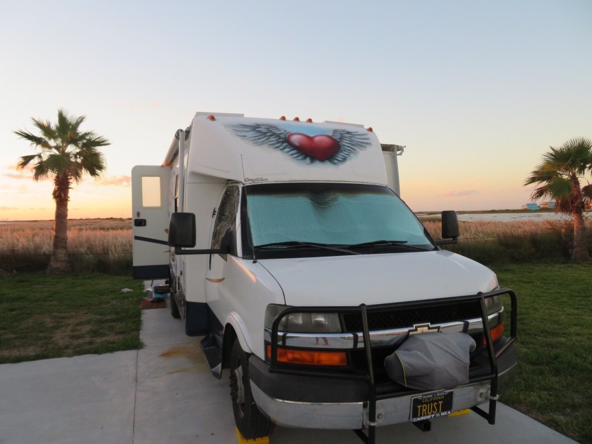Stopped at the Walmart in Alice, Texas for a major stock up before crossing the border tomorrow. In the same center was a Verizon store so we switched Pam’s plan to one that will work in Mexico. The day is getting on and I’m getting tired. Heavy wind always makes for an uncomfortable commute. Can’t lose focus for a minute and constantly working the steering wheel. They are resurfacing a lot of TX 44 and we had to sit in a queue and wait on several occasions. Gassed up in Encinal at $1.89 a gallon, our last taste of sub $2.00 gas for a while to come. I checked online and it looks like Pemex is sitting at about $2.70 a gallon once the conversions are made.