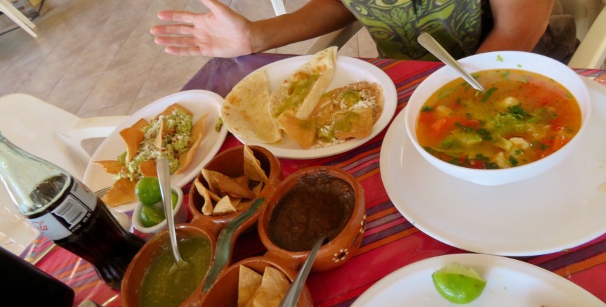 We came across a sidewalk restaurant and sat down for some vittles. Fairly healthy fare. I had grilled marlin tacos while PJ ordered up a pair of quesadillas, vegetable soup and we had a side of guacamole. The star of the program was the vegetable soup. Fresh al dente veggies and a delicious broth. Best veggie soup I’ve yet encountered. We took our time eating and watching people passing by on the street. Lots of families in town for the weekend with kids in tow all excited to get to the beach carrying their little life rings to float around.