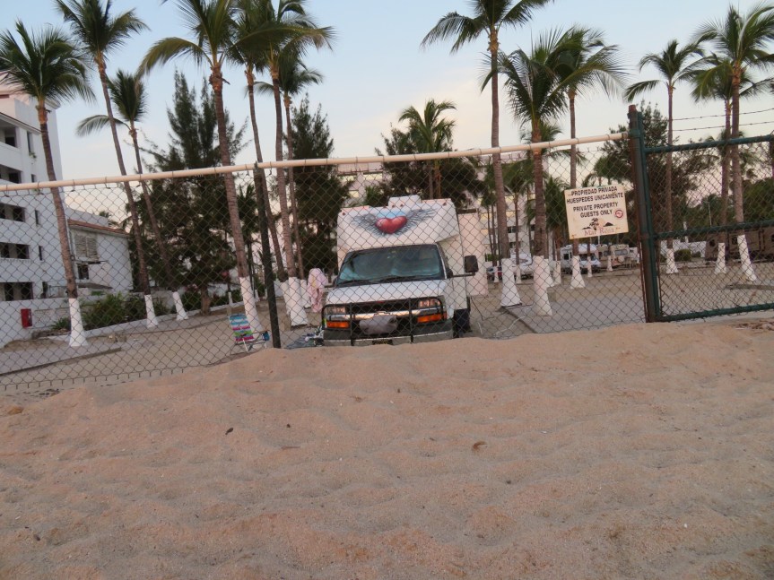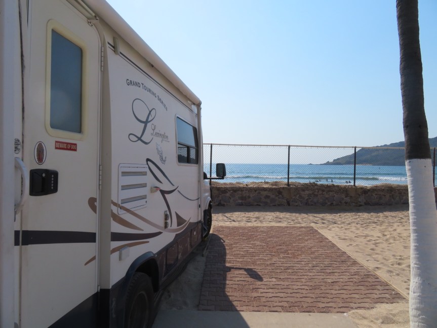 The ride was a blast and knowing that the beach waited at the end along with multiple days of no driving made the day’s atmosphere much more upbeat than the past few stops. Soon the pines gave way to jungle and the air became hot and humid. Soon a salt breeze could be smelled and we took our exit into the Zona Dorada. We threaded our way through the traffic on Camaron Sabalo and soon came upon the Mar Rosa trailer park. We were worried that they might not have room, but when we arrived the place hardly had any travelers.