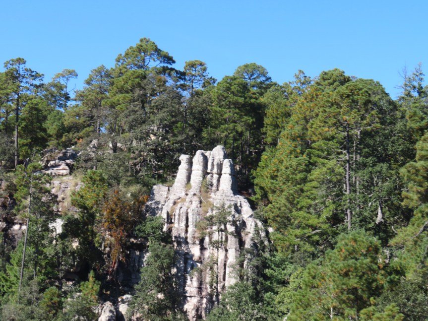 The road climbed up out of Durango into a pine forest at an elevation of over 8000 feet. Lots of climbing, up some pretty steep hills. The RV struggled on some of the inclines and I’m not sure that the altitude helped any. We were climbing the “Devil’s Spine”, a notorious road for accidents and an area known for growing marijuana and opium poppies. The scenery was amazing, forests of mixed evergreens and deciduous trees with outcrops of granite boulders. Long suspension bridges spanning deep chasms that looked like mini grand canyons.