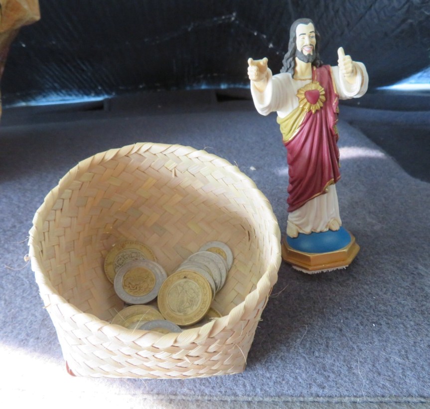 There was only one other camper set up on the front row, so we had our pick of spots. We took one over near the far end and set up camp. After getting everything set, we took a walk down to the bank and pulled out a few more pesos. An older woman was selling woven baskets outside of a store we visited and I wanted a small one to hold the ever growing pile of peso coins we were accumulating. We dusted off our rusty bargaining skills and PJ accepted the second counter offer. Two cool little baskets for $2.50.