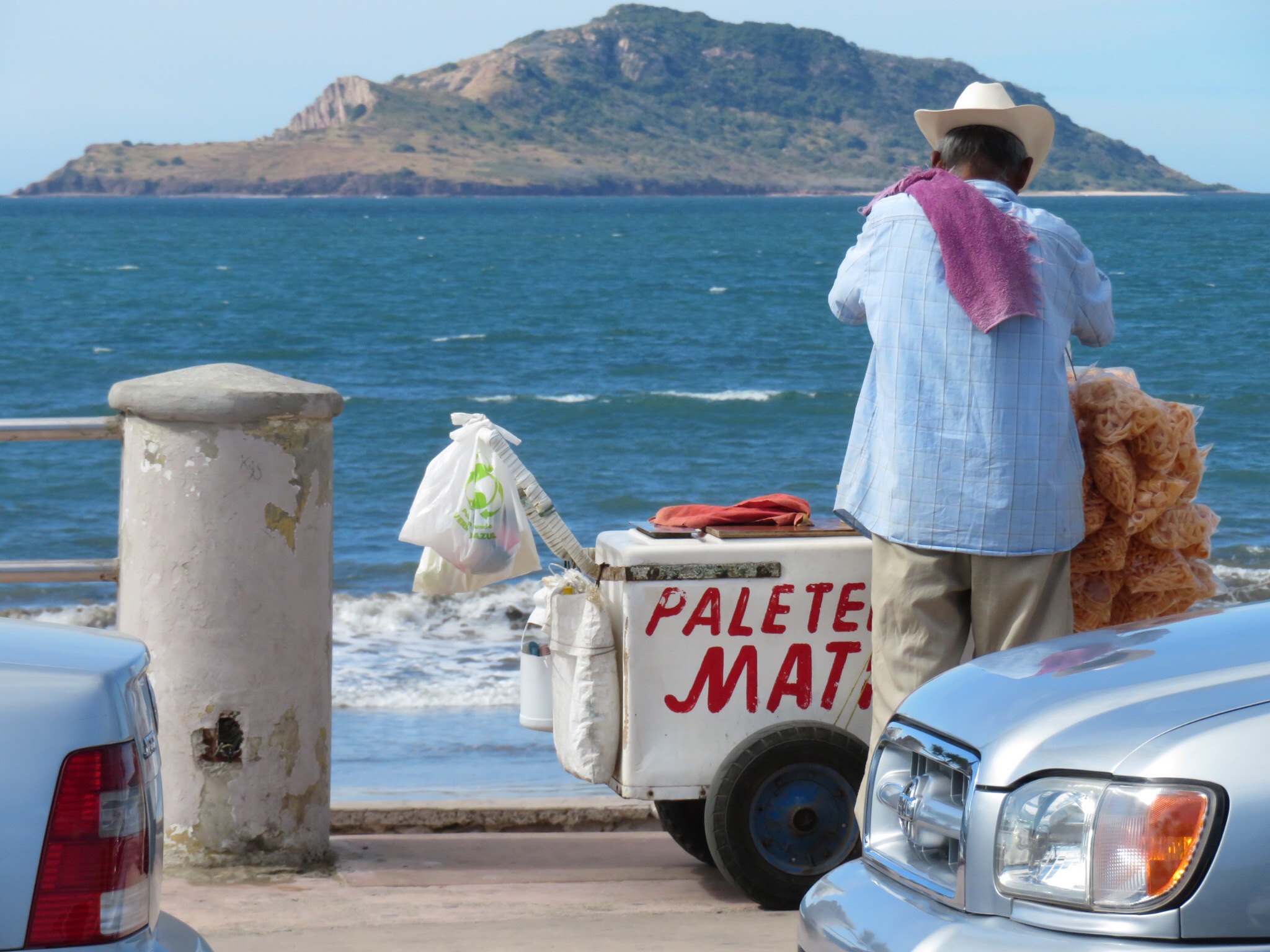 We walked around going in and out of the market stalls and some women’s clothing places. Couldn’t quite find the right material, style or size in any of the shops. Finally, we came across some soft blanket fabric ponchos with NFL logos on them. Seemed like they might fill the bill even if only temporarily, so Pamela picked out a Patriots labeled serape and we headed back to the main street. Along the way, we picked up a pair of fun sunglasses for PJ and a Mazatlan cap for me. Busy shopping evening. We had in mind to stop at the Thrifty ice cream shop and get a cup of ice cream, but we must have missed the location.