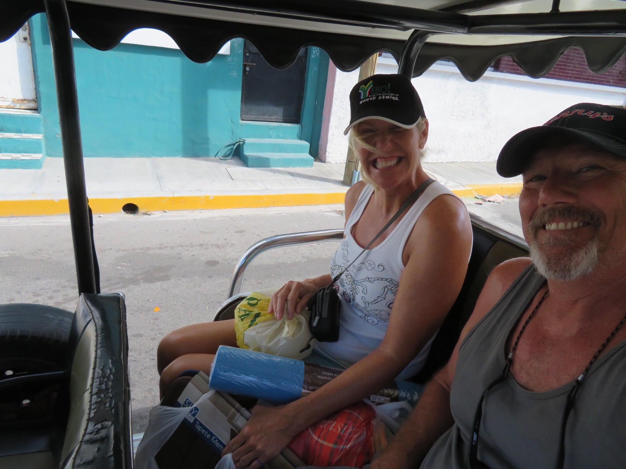 Our first stop was the Parisiana store to get another mat and some material that Pamela had seen there the other day when we bought my sheets. She figures the brightly colored fabrics will make nice table runners or even tablecloths for a smaller table. The store was packed and people were pushing and fussing at the clerks. You choose the items you wish yo purchase then the clerk gives you a ticket with the items and prices and takes your things to a counter near the front, then you pay at a cashier and get a receipt which you then bring to the front counter to exchange for your stuff. Cumbersome and awkward, but I guess it keeps the staff from ripping off their employer.