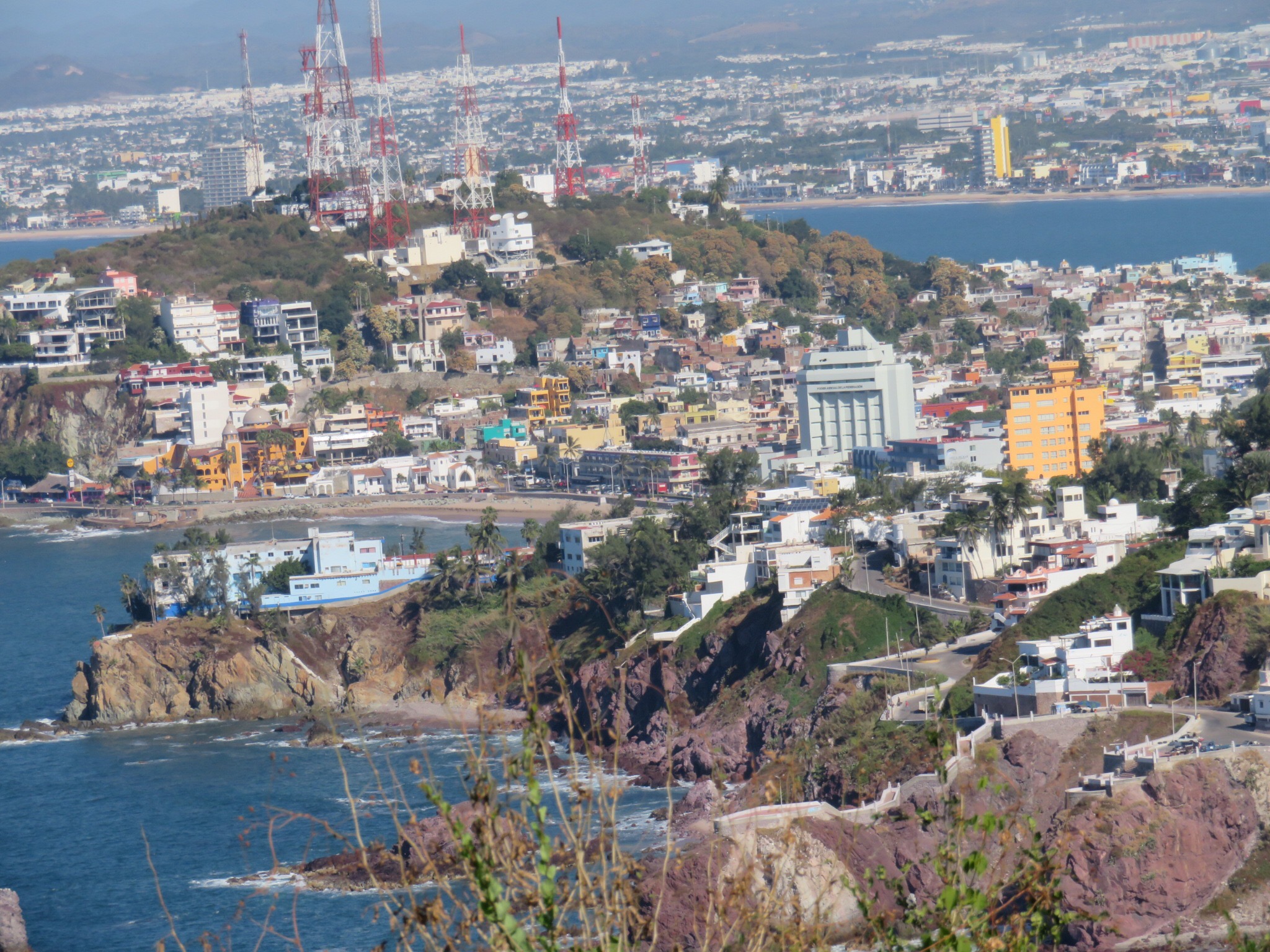 The views get more and more spectacular the higher you climb. There were a few people scattered around at the observation area at the top. Amazing views from all sides. The lighthouse operator lives up here 24/7, selling refreshments by day and manning the light at night. We took a bunch of pictures and sat on a bench and enjoyed the view. We could see all of Mazatlan and the beachfront at Stone Island and miles down the beach from there.