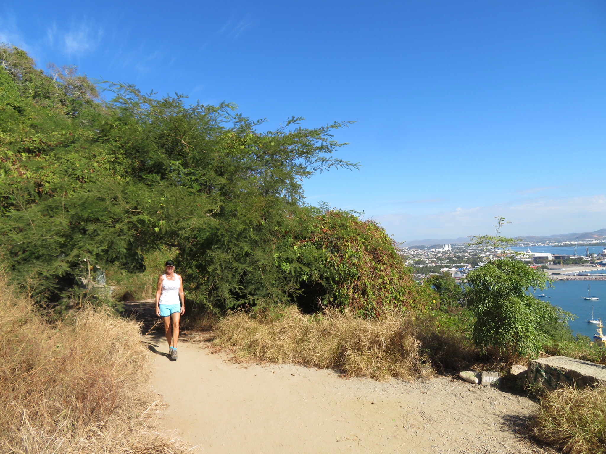 Today, PJ celebrated 11 years clean and sober, always an inspiration to me. We started the day with the usual dog walk down to the rocks at the north end of the beach. PJ decided that she wanted to take our friend Suzie’s advice and go for a hike up to the lighthouse at the south end of town. At 523 feet above the high tide line, El Faro de Mazatlan is the highest lighthouse in the Americas. We flagged down a pulmonia out front and when we got in Hank, another one of the campers from Mar Rosa, hopped in with us and got a lift down to the bank. Known to all the locals as Santa Claus, Hank looks the part with his big white beard. He’s been coming down to Mazatlan for the past 16 years and is a favorite with the pulmonia drivers.