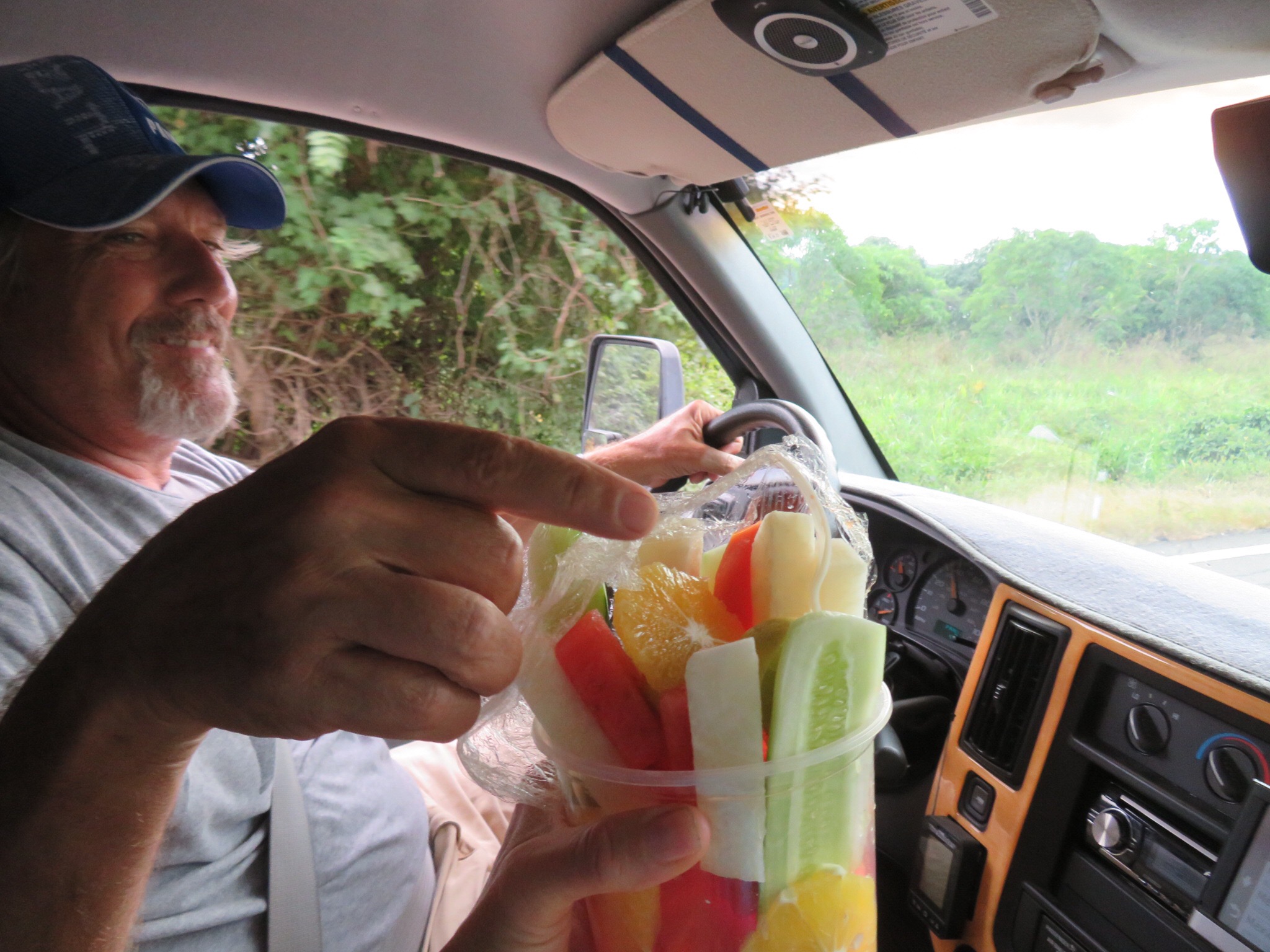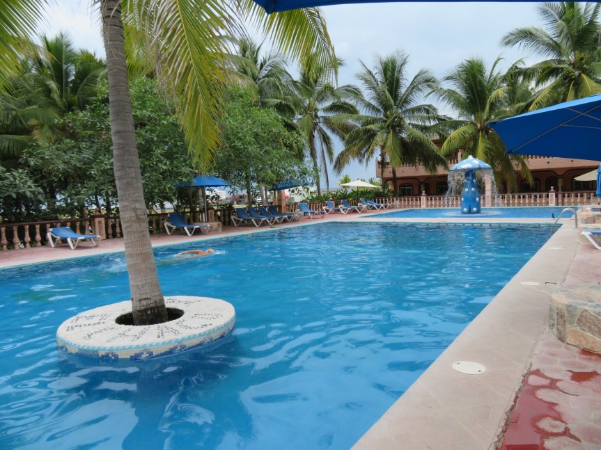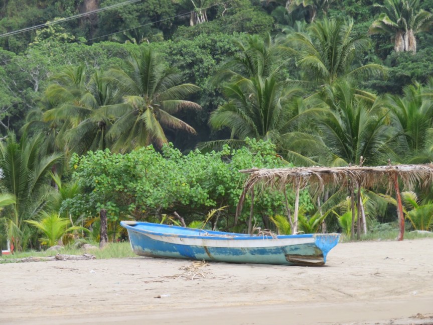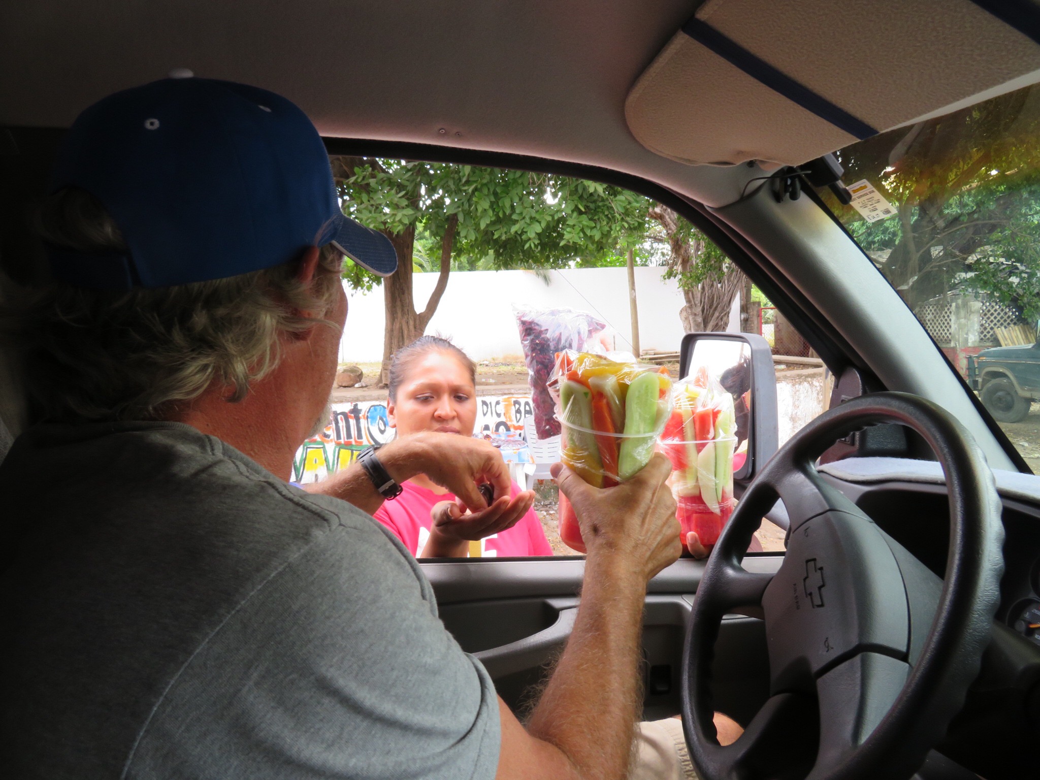 Lots of small villages with their requisite topes, speed bumps of varying design bringing traffic to a crawl. Vendors were taking advantage of the slowing by stepping up to the car to sell their various goods. Mostly dried shrimp, fruit or some kind of nut. We bought a big cup of fruit for a buck and snacked on it as we were avoiding trees coming up to the turn off to Matanchen. We stopped for a moment to regroup. PJ put the items that were shaken out of the closet back in their place and I asked a storekeeper how much further El Chaco hotel was. Close, he said, close.