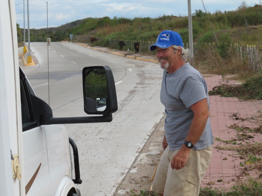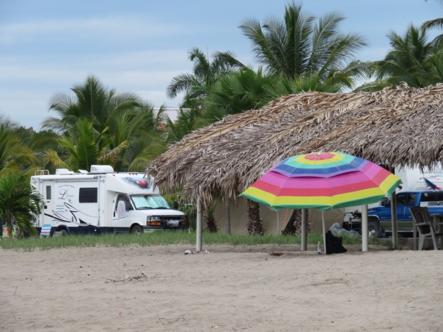 Finally, the roadwork ended and we rolled up to El Chaco. They have 5 or 6 RV slots on the grass adjacent to the beach at Matanchen Bay and we rented one for two nights. The long timers were using the two open sites for parking their trucks, so we had to hunt them down and ask them to vacate a slab for us. John’s our neighbor, an annual visitor from Idaho who likes to spend the cold months here at Matanchen. He helped me get parked up and answered my questions about the area. Really relaxed vibe.
