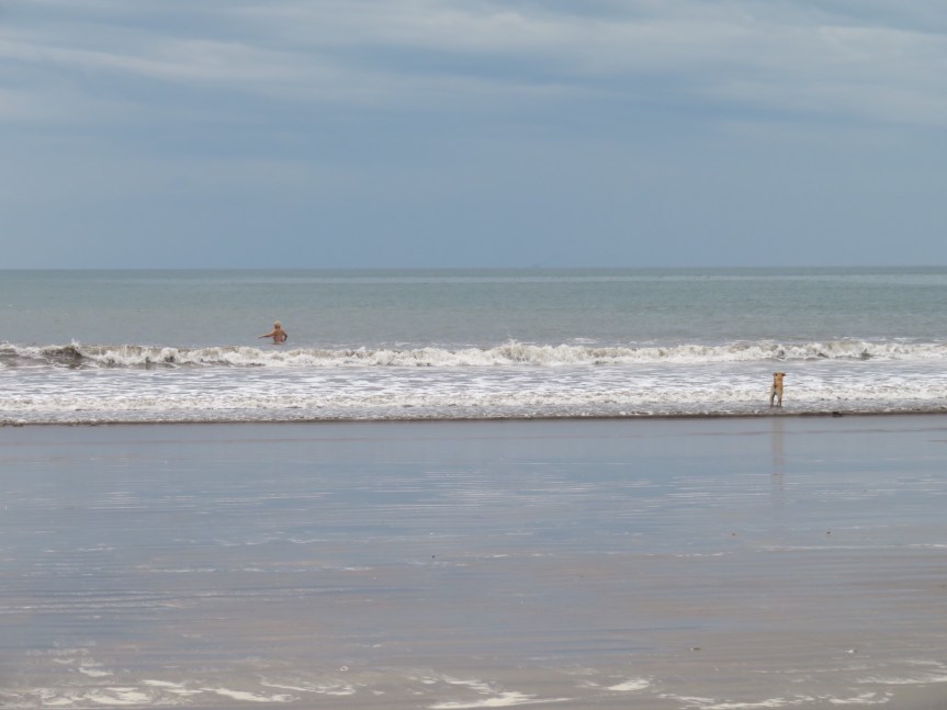 We took the dogs out on the beach and had a swim ourselves. Really fine sand that gets churned up by the shorebreak and into your shorts, hair and eyeballs. We put the dogs inside and had a swim in the nice large pool. No one else around. Refreshing water and beautiful surroundings. We hung out for a while, then went back to the RV and cooked up an early dinner.