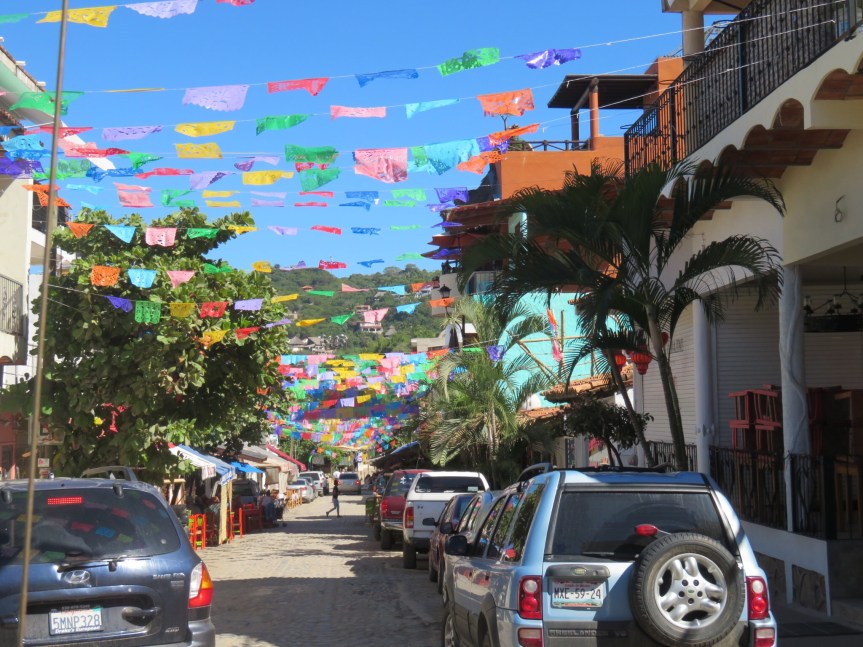 It got really hairy when the road led downtown where the restaurants put their tables halfway out in the street, golf carts were double parked and throngs of tourists walked the center of the street. Packed but festive with banderas hanging overhead and colorful restaurants and shops lining the road. Definitely not made for RV travel though and some of the stares proclaimed as much. Sayulita is a mass of humanity. Every form of tourist, local, part time local and wannabe local flooding the streets in a never ending spring break.