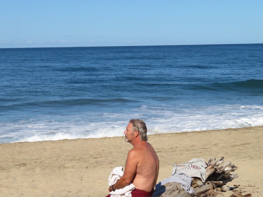 Our next stop is only 6 miles up the road, so we took our time getting loaded up. Took a plunge in the rough shorebreak out front, then came back for outdoor showers at the campground. The water was pumped to a cistern up in the trees and then the water came out in a narrow stream from the rusted piece of pipe attached to the bottom of the tank. It did the job, so clean and fresh we worked our way through the narrow cobblestones back out to the main highway.