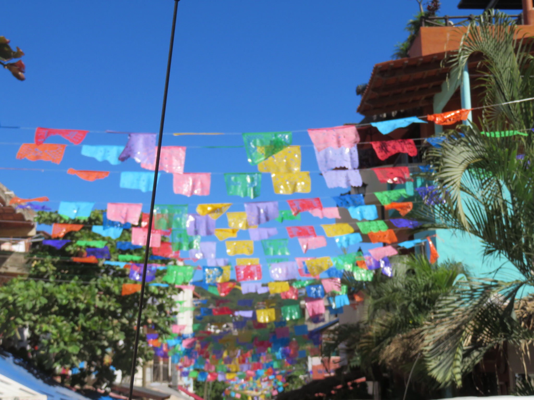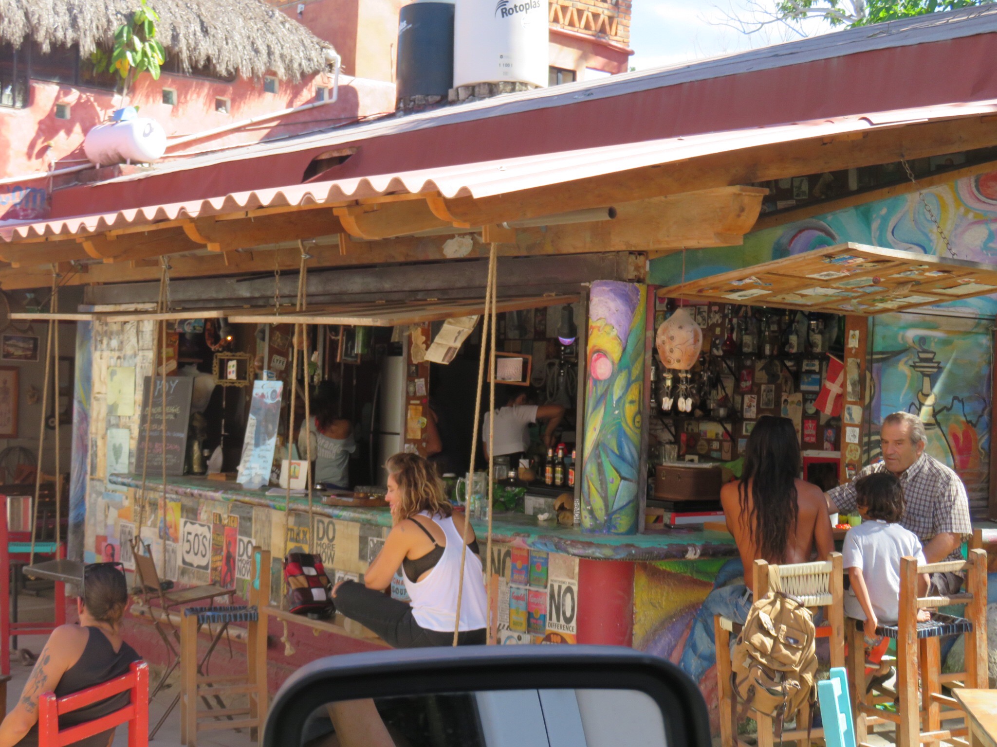 It got really hairy when the road led downtown where the restaurants put their tables halfway out in the street, golf carts were double parked and throngs of tourists walked the center of the street. Packed but festive with banderas hanging overhead and colorful restaurants and shops lining the road. Definitely not made for RV travel though and some of the stares proclaimed as much. Sayulita is a mass of humanity. Every form of tourist, local, part time local and wannabe local flooding the streets in a never ending spring break.