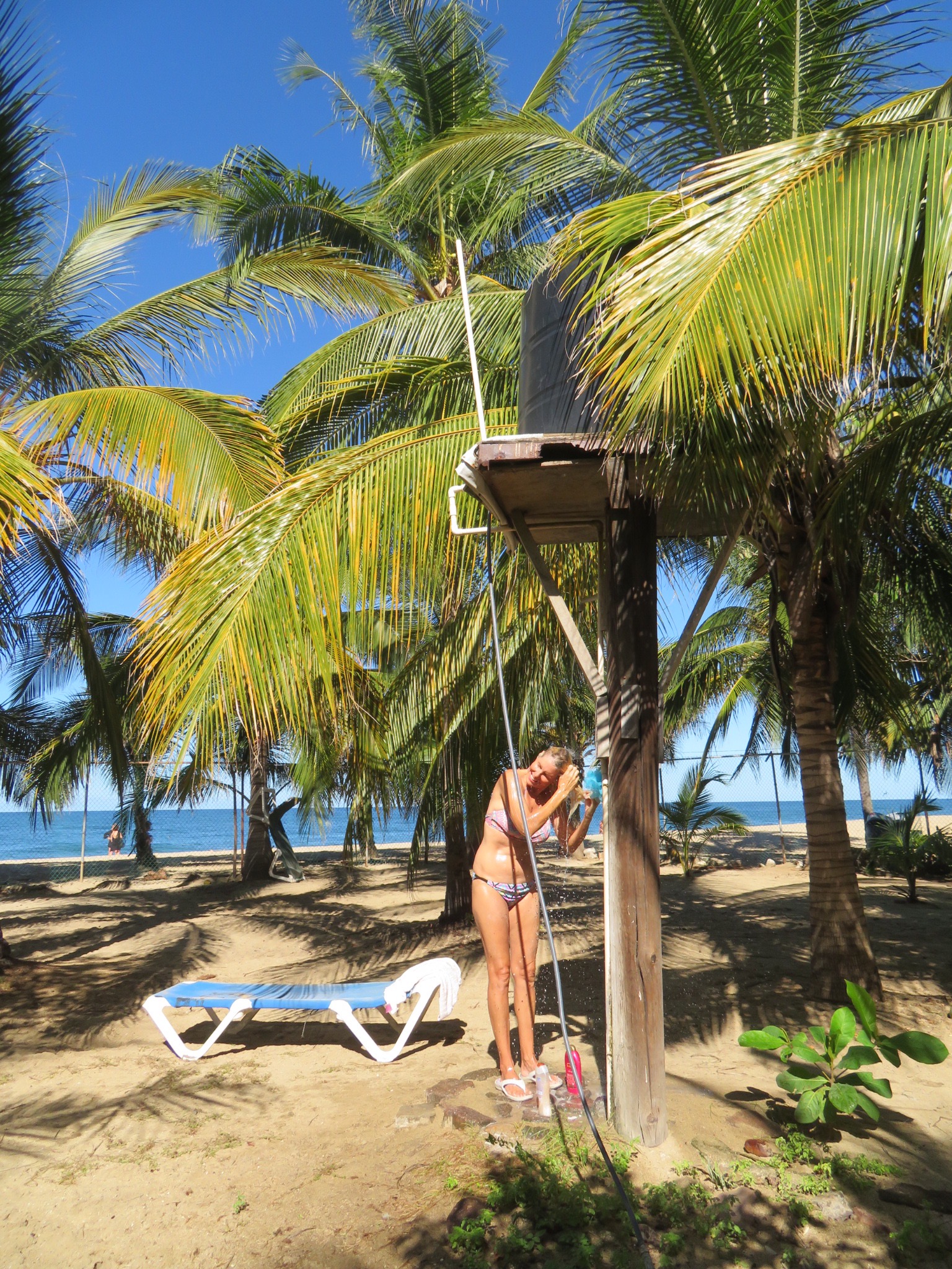 Our next stop is only 6 miles up the road, so we took our time getting loaded up. Took a plunge in the rough shorebreak out front, then came back for outdoor showers at the campground. The water was pumped to a cistern up in the trees and then the water came out in a narrow stream from the rusted piece of pipe attached to the bottom of the tank. It did the job, so clean and fresh we worked our way through the narrow cobblestones back out to the main highway.