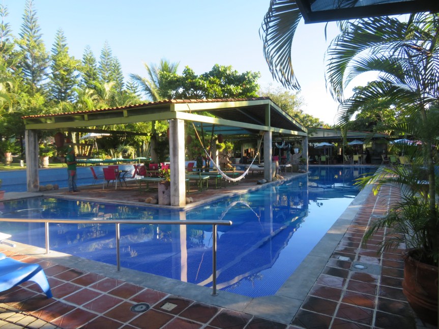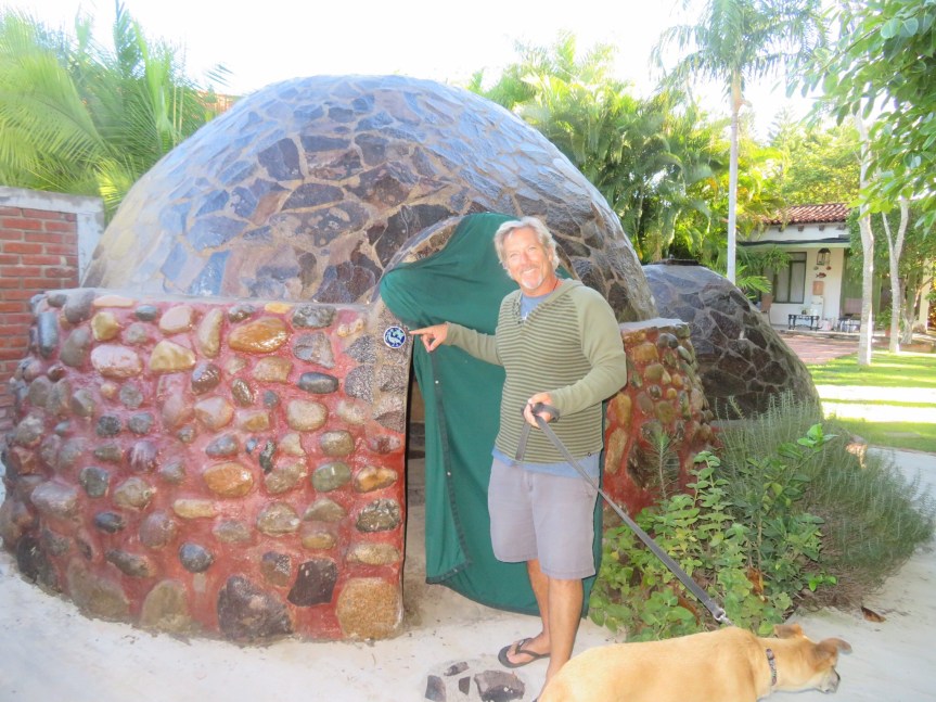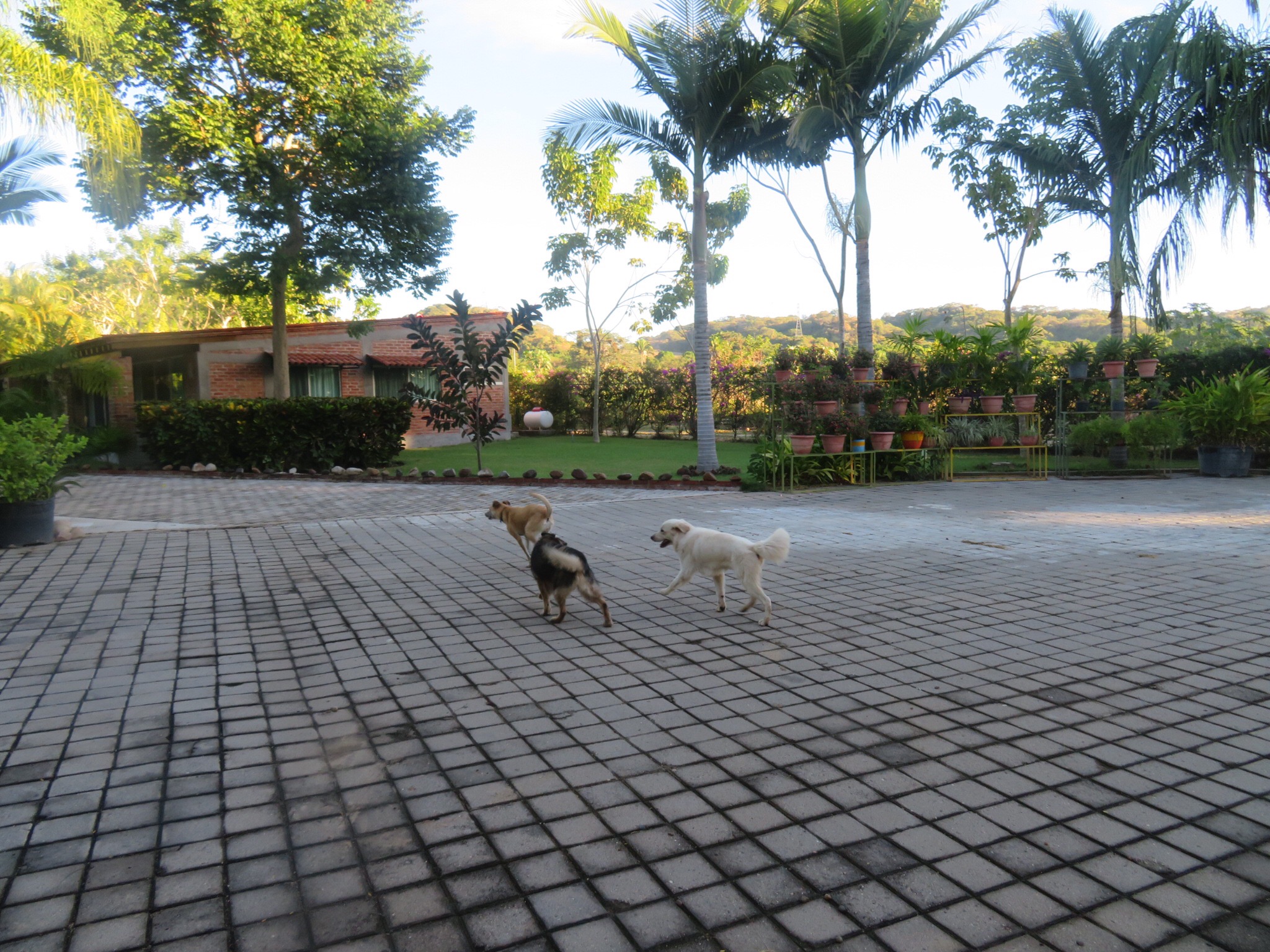 I got up early and wandered around the compound. Lots of interesting niches and leafy hideaways to relax in. The bungalows are spread among the trees and arroyos of the property. A number of dogs were roaming around the property. Russo, a white lab mix and Negra, a smaller black typical Mexican style mutt followed me over and met Cali and Koda. Negra wanted no part in the horseplay and beat feet, but Russo chased our dogs around until his play got a little too rough for Koda.