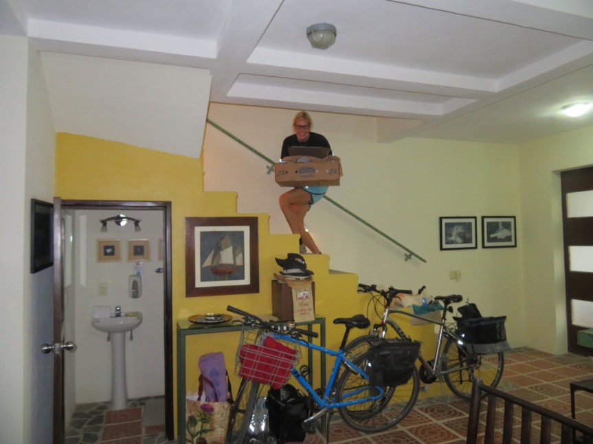 We went to the office and got the keys for our new place and arranged for Joaquin to come over with the flatbed truck and help us transfer our household; cloths, extra bedding, food, dog accessories and bicycles. We moved everything in then discovered that the key for the patio door didn’t lock the door. We raced over to the office on our bikes and Alfredo gave us the master key ring for our apt. and we took the collection of keys back to the casita and figured out the right key so we can lock ourselves up at night.