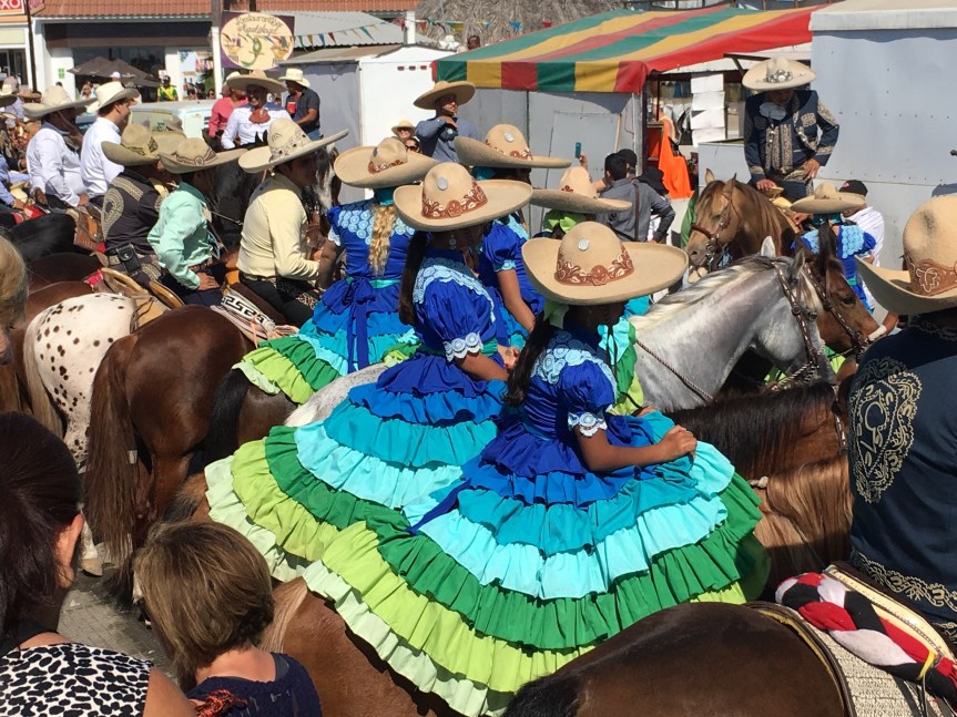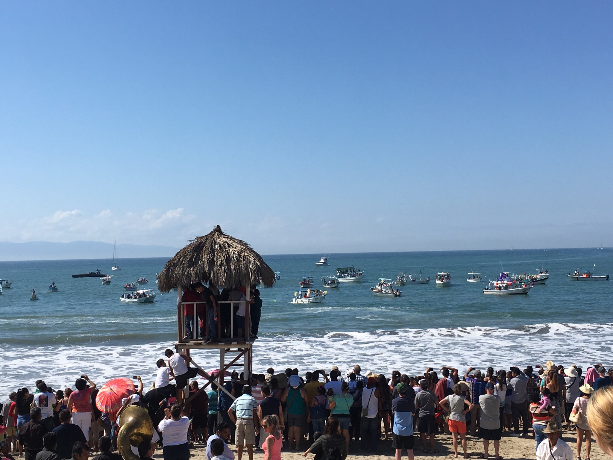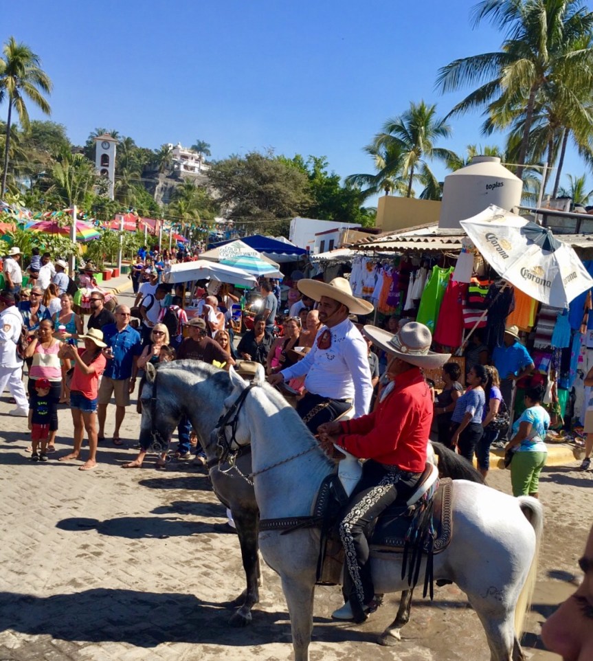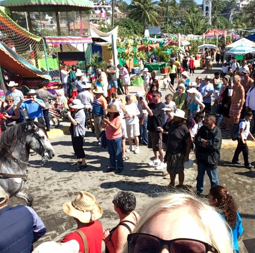PJ walked into the plaza in Bucerias for the festival of the fishermen. This was the big day of the week long celebrations where the fishing boats come in a procession across the bay and land on the beach where the Padre from the church blesses their pangas. There was parades, dancing and carnival rides with large crowds filling the plaza. PJ impressed me with her spirit of independence cruising through the crowds solo and jumping into the fray.