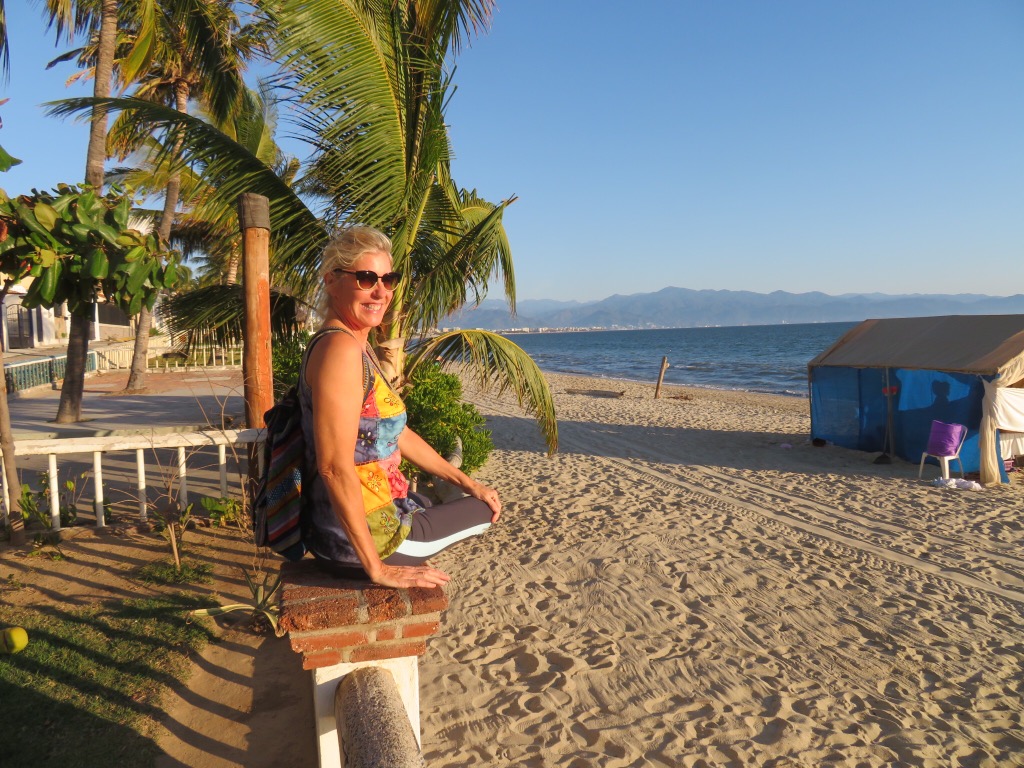 Lounged for awhile then we caught a ride back into town with Lupe. We hopped out at the highway and walked down the hill into the Golden Zone. We strolled around window shopping and looking at rentals until we arrived at La Postal restaurant where we staked out a table amongst the trees and ordered up a pizza and a capresse salad. Killer pizza with the flaky wood fired crust. Took our time and had good conversation and nice surroundings. We walked down to the water and watched the jet ski guys blast their watercraft up onto the sand to put their toys away for the day. Beautiful Bucerias evening. Walked over to the meeting in the arroyo.