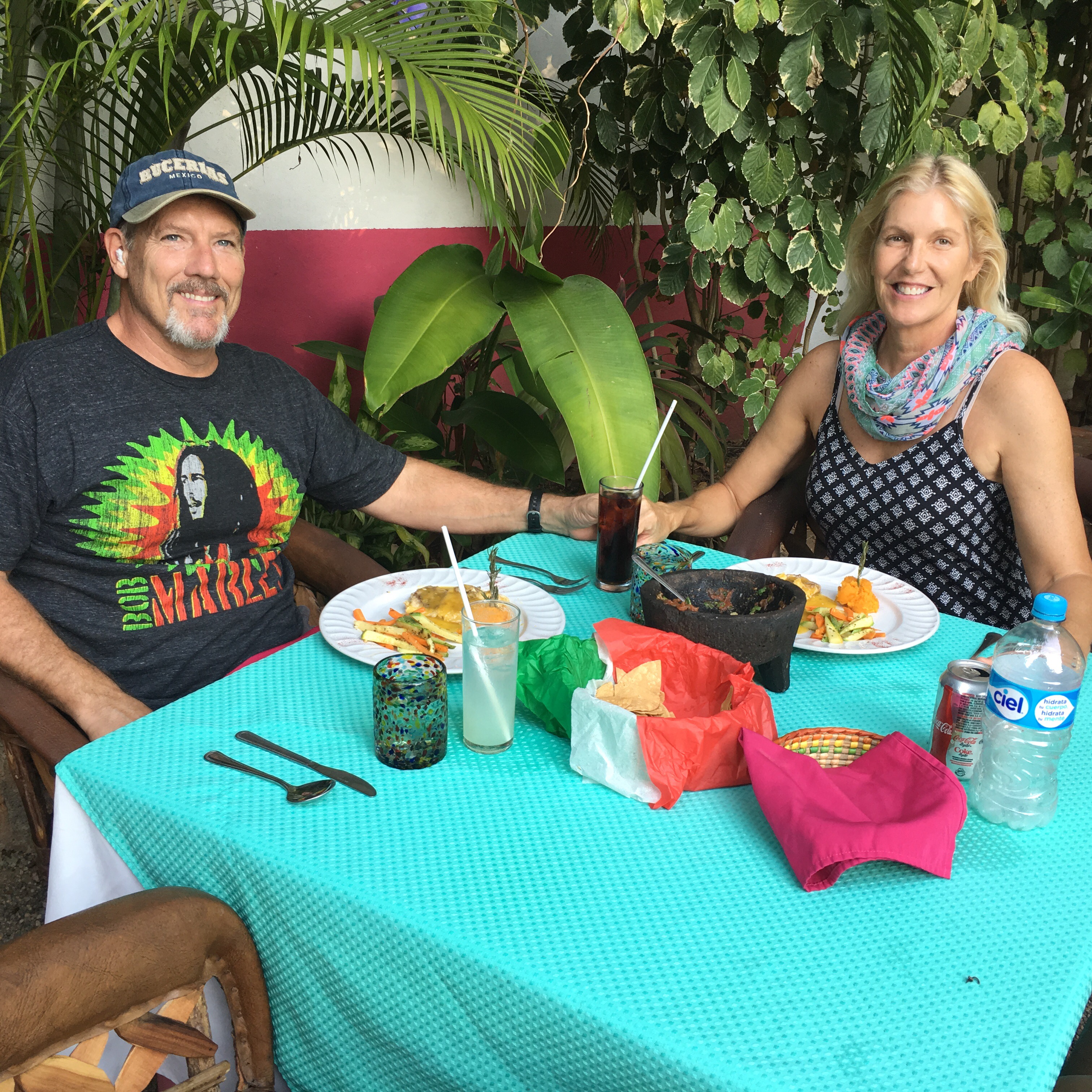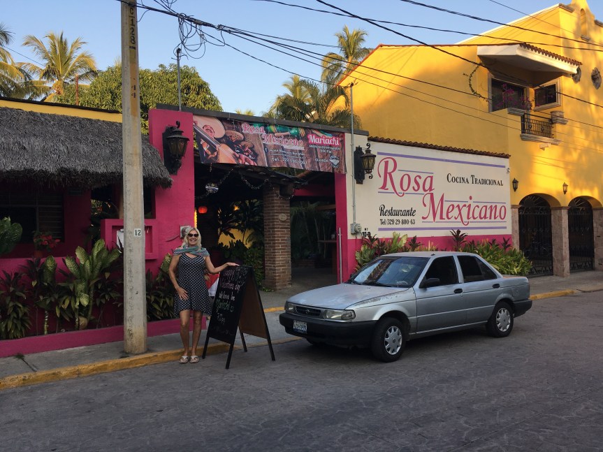 PJ and I took the 5:00 pm shuttle down to the Santander bank and pulled out some pesos then hopped and skipped across the traffic on 200 to get into the tourist area on the beach side of the highway. We walked down to the main beach road and decided on La Rosa Mexicano for a dinner spot. Nice romantic setting with tables tucked in amongst the trees in the back garden not visible from the street.