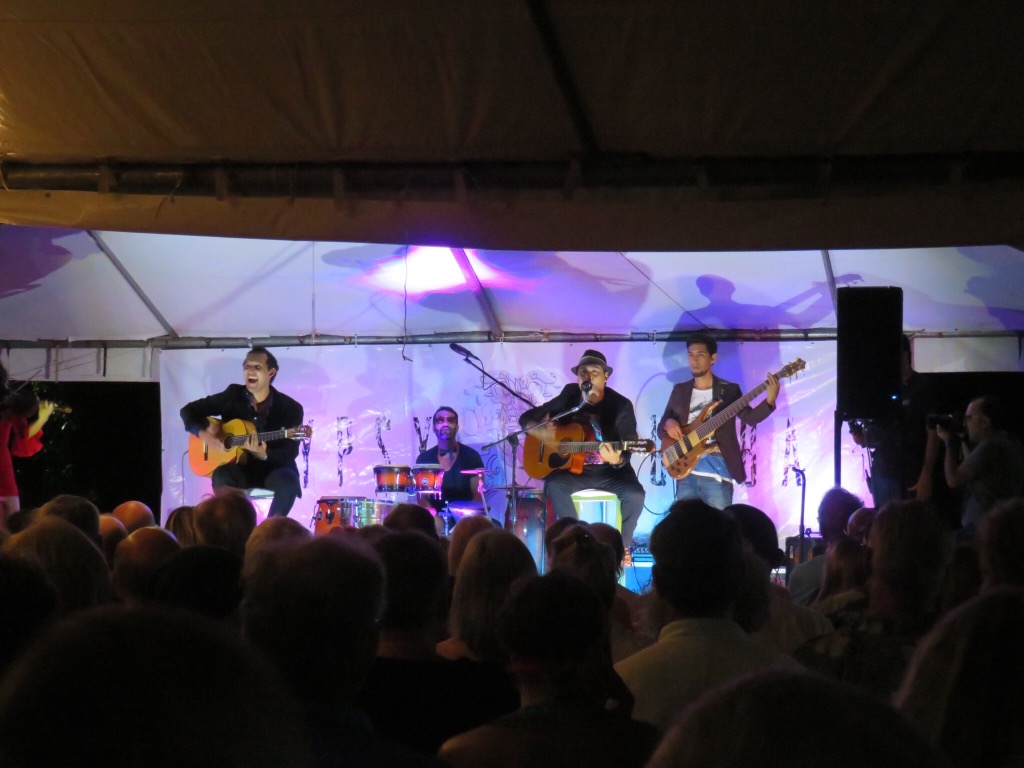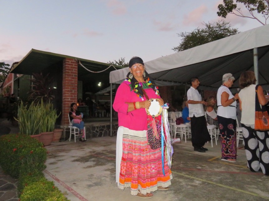 We took them on a tour of Los Arroyos Verdes and passed by the event center just as the entertainment was starting up. We watched a belly dancer and some acrobats then I ran back to the casa for our tickets and we grabbed some seats by the bar area and watched the show. After another act where a couple climbed up on each other and balanced one on top of the other using handstands and other acrobatic moves, the music began. Then the band started playing their Latin tunes and the crowd was into it.