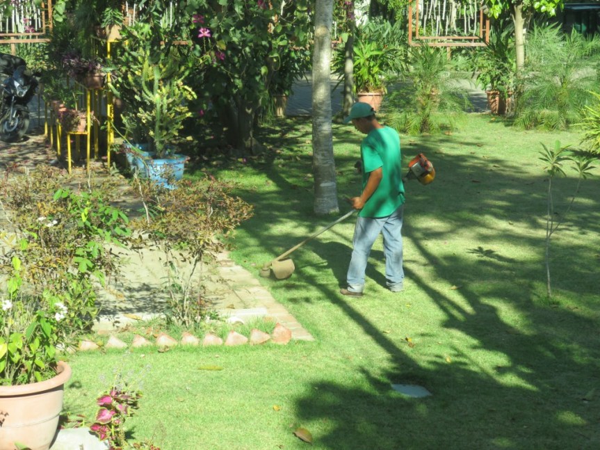 PJ wasn’t around when I got back, so I sat around on the porch eating a bolillo as I waited. Finally found her over by the pool and she let me in. We both needed a nap, so we lounged awhile and I read my book then snoozed a bit. No sooner was I dozing off than my nemesis ‘the yard guy’ appeared right outside the window firing up his unmuffled weed whacker and going to town on the lawn.
