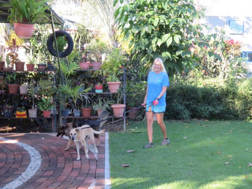 Today, we were up fairly early, doing a little reorganizing and having a cup of tea before grabbing the hounds and stepping out to stretch our legs. We went all the way into the outskirts of town where we were sidetracked by a Mexican guy who had worked for many years in San Diego. He was walking back to his plastic sheet house carrying a skewer of shrimp on a stick, an interesting choice for breakfast. He seemed mildly high. It was a bit early to be drinking so maybe he was still a little buzzed from the night before. He would have kept talking all day if we hadn’t gently broken away. He kissed PJ’s hand, we said adios then hiked on back to the house.