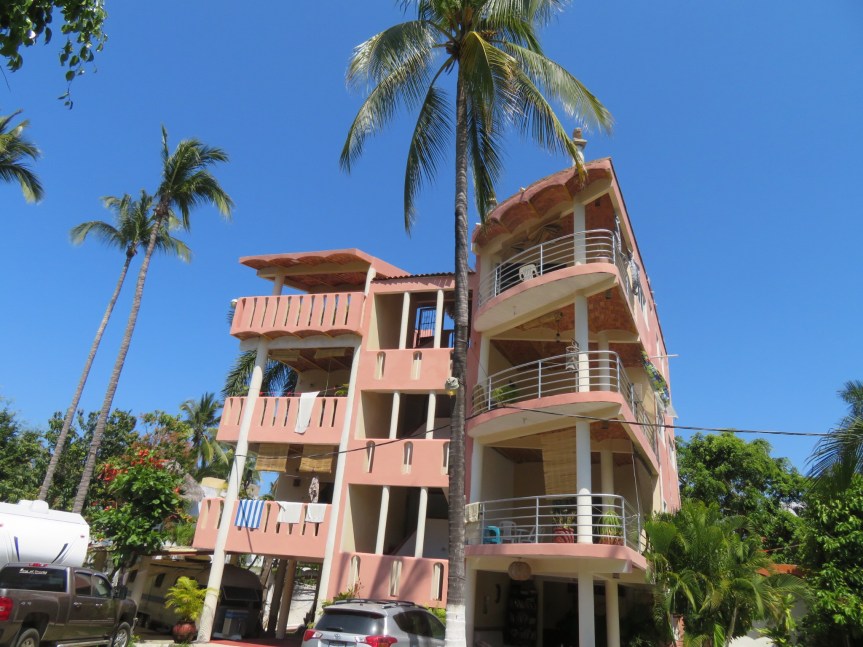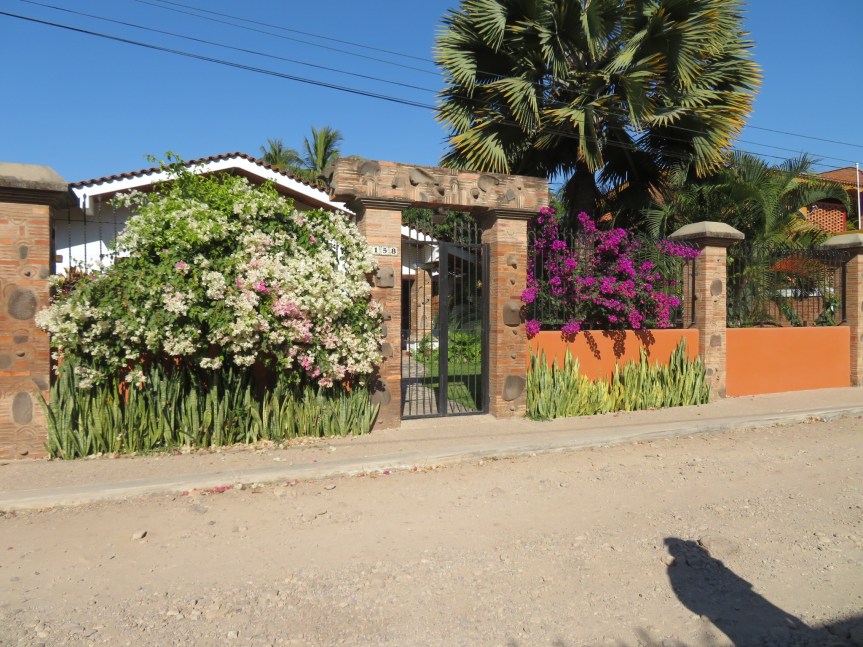The second studio was cleaned up and ready for us upon our return. We put some of the groceries away then relaxed on the balcony. We decided to take an exploratory walk around some of the back streets and see what was there. The dogs were game and we headed out the door. Quite a few gringo estates along the dusty lanes. We wandered a while then popped back  out at the beach and climbed back up the four flights of stairs to the upper deck.