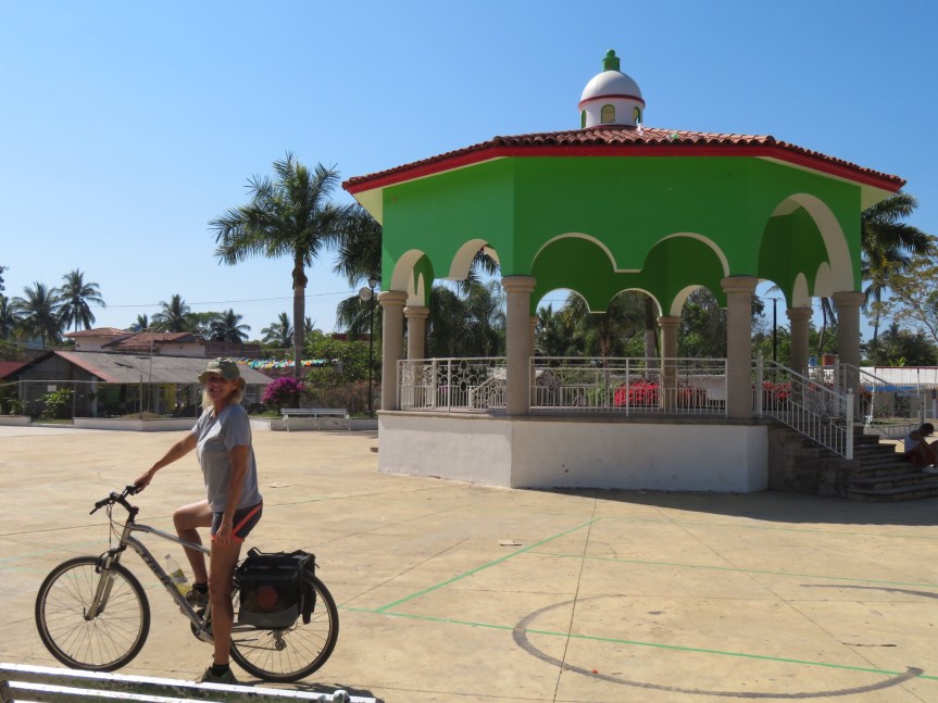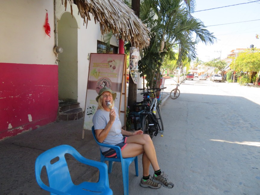 Satisfied, we picked up a load of groceries at the small store and hauled them back out to Pequeno Paraiso. We couldn’t stop the handlebars from turning into the curb in front of the ice cream store. Grabbed a paleta and we sat on the curbside chairs watching life go by on the dusty cobblestone street. A caravan of RVs from Quebec rolled past heading to one of the trailer parks on their way back north. We paused in the town square and took a few pictures then headed for home.