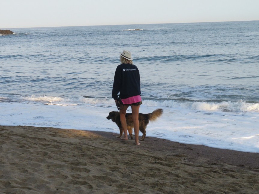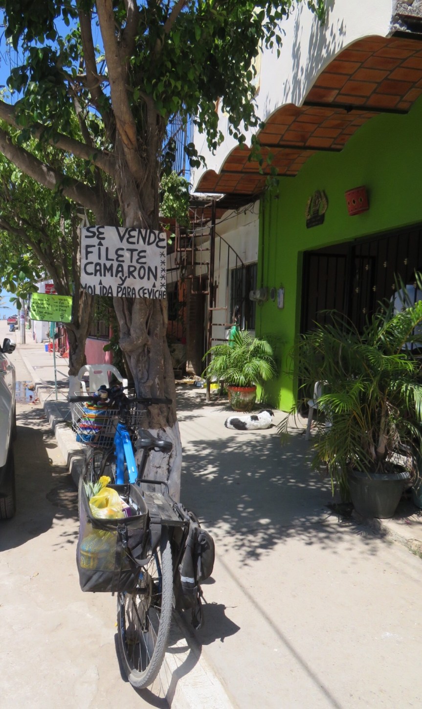 After the general store, I pedaled down to the fish market and bought a few sierra filets and a half kilo of shrimp. Went home and just gave our colds a rest for the remainder of the day. I made an early dinner of shrimp sautéed with garlic and mushrooms. After that it was more lounging and when the evening bombs got the dogs all stirred up, we walked back into town to tire them out a bit. My embarrassing moment was stopping into the store and gathering a bunch of groceries before realizing I had left the wallet at home. We walked back down the mellow coastal road under the light of the full moon and relaxed.