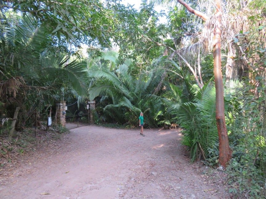 The road out front goes up a hill to the right that runs into a secluded beach at the far end of town. This morning for our dog walk, we decided to explore the area and see what’s over there. We crested a small rise and came to a fenced off property at the bottom that sits on its own private patch of beach. A cute caretakers shack with four curly haired guard dogs keeps potential looky loos from sneaking past the barbed wire fence.