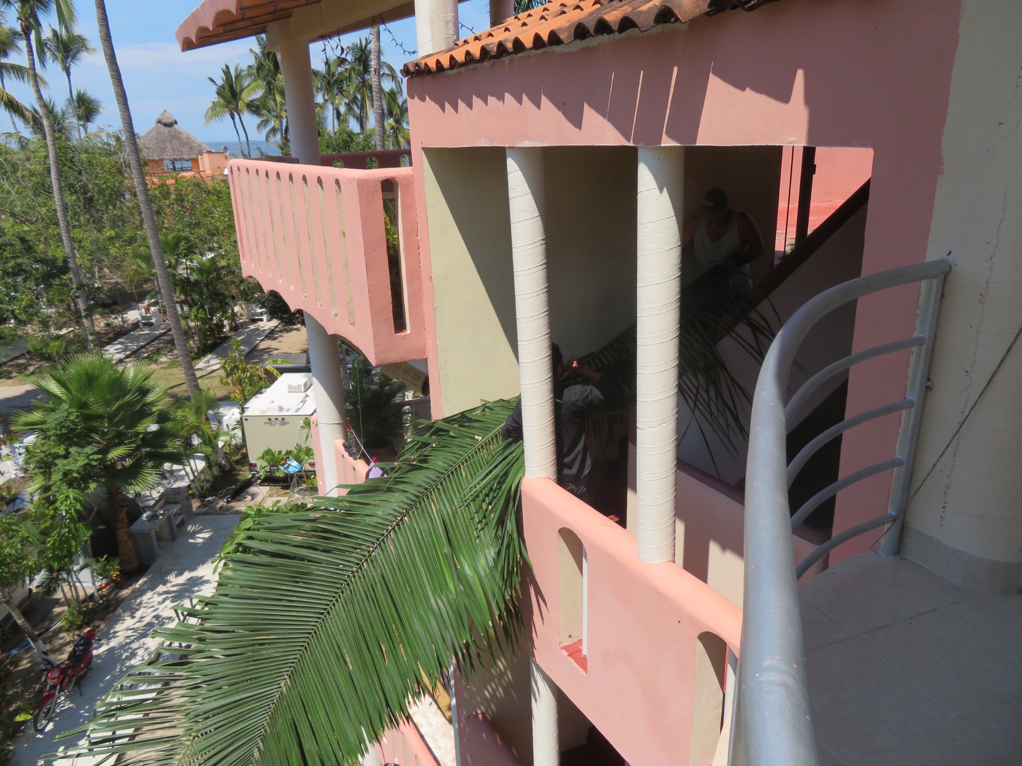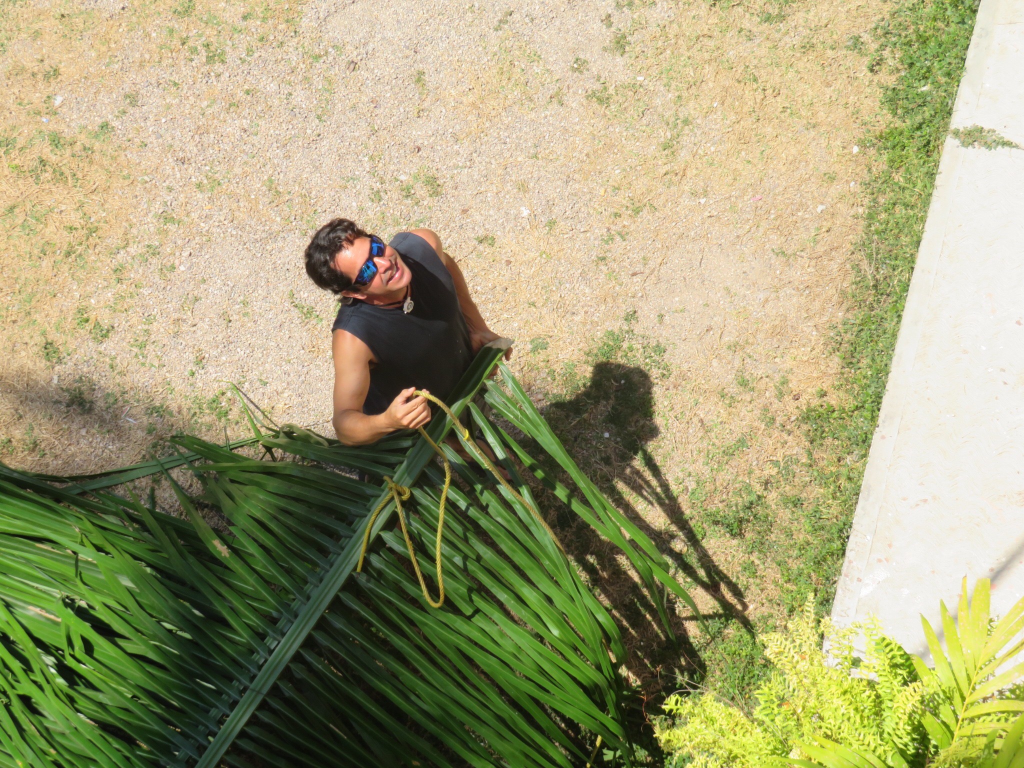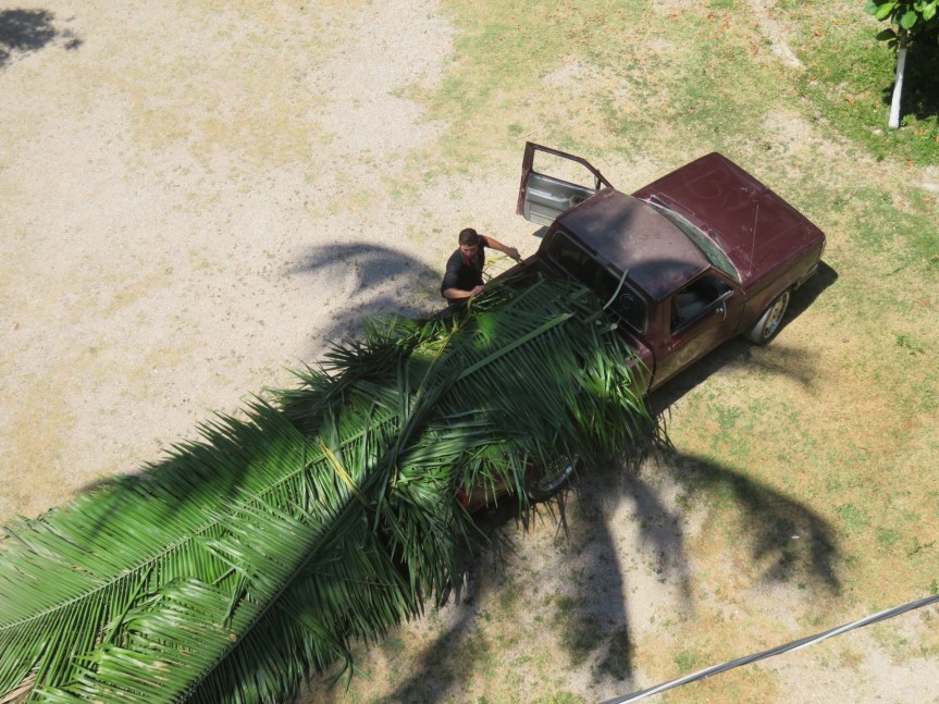 We formed a chain with Miguel on the ground tying a rope to two fronds at a time. Jose Luis was on the landing between the 3rd and 4th floors hauling up the rope and I grabbed the palms from there and pulled them up the stairs onto the star deck above. In short order, we had them all staged on the deck, maybe 30 fronds in all.