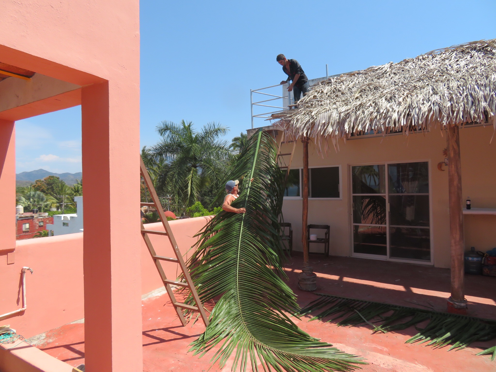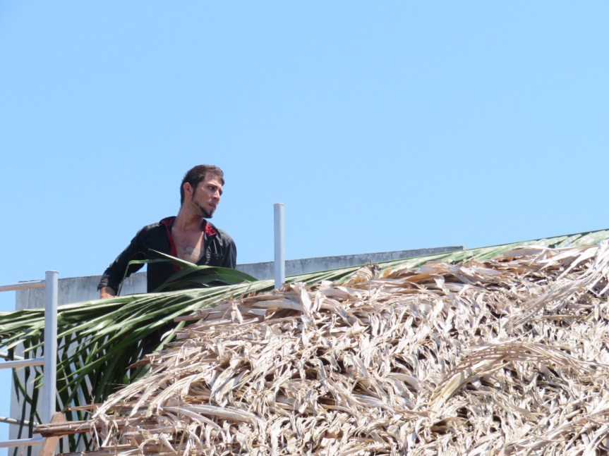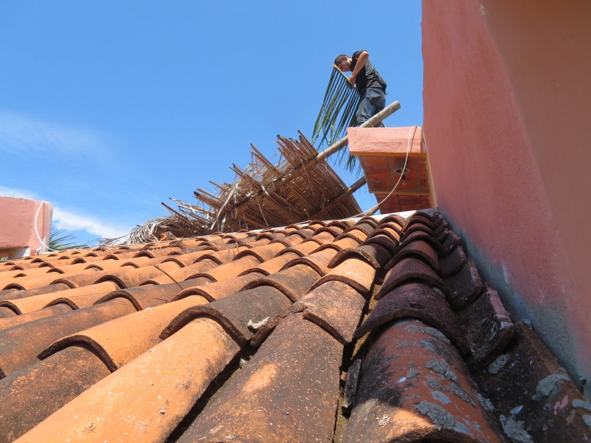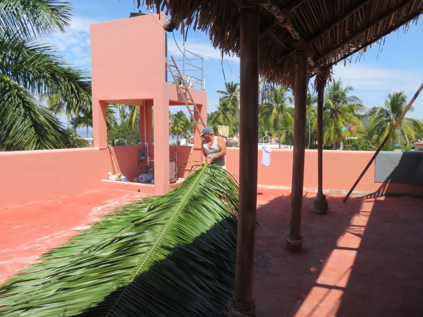 He finished up late in the day running out of material. Tomorrow, Jose Luis will go trim some palms for another customer, then bring more fronds to do a slight return back towards the back of the house creating a peak at the top that flows water off both ways. He’s also promised to bring us some coconuts.