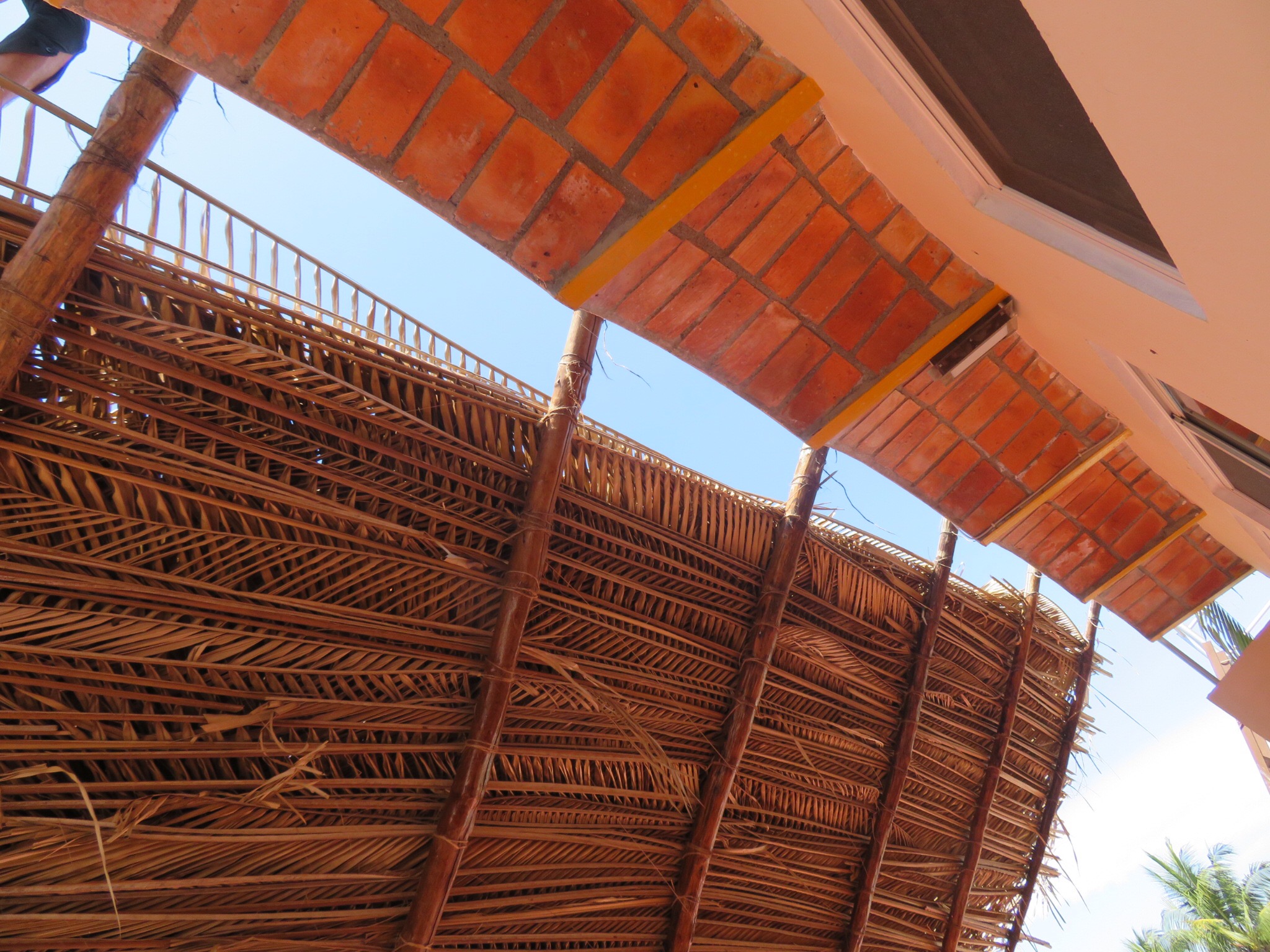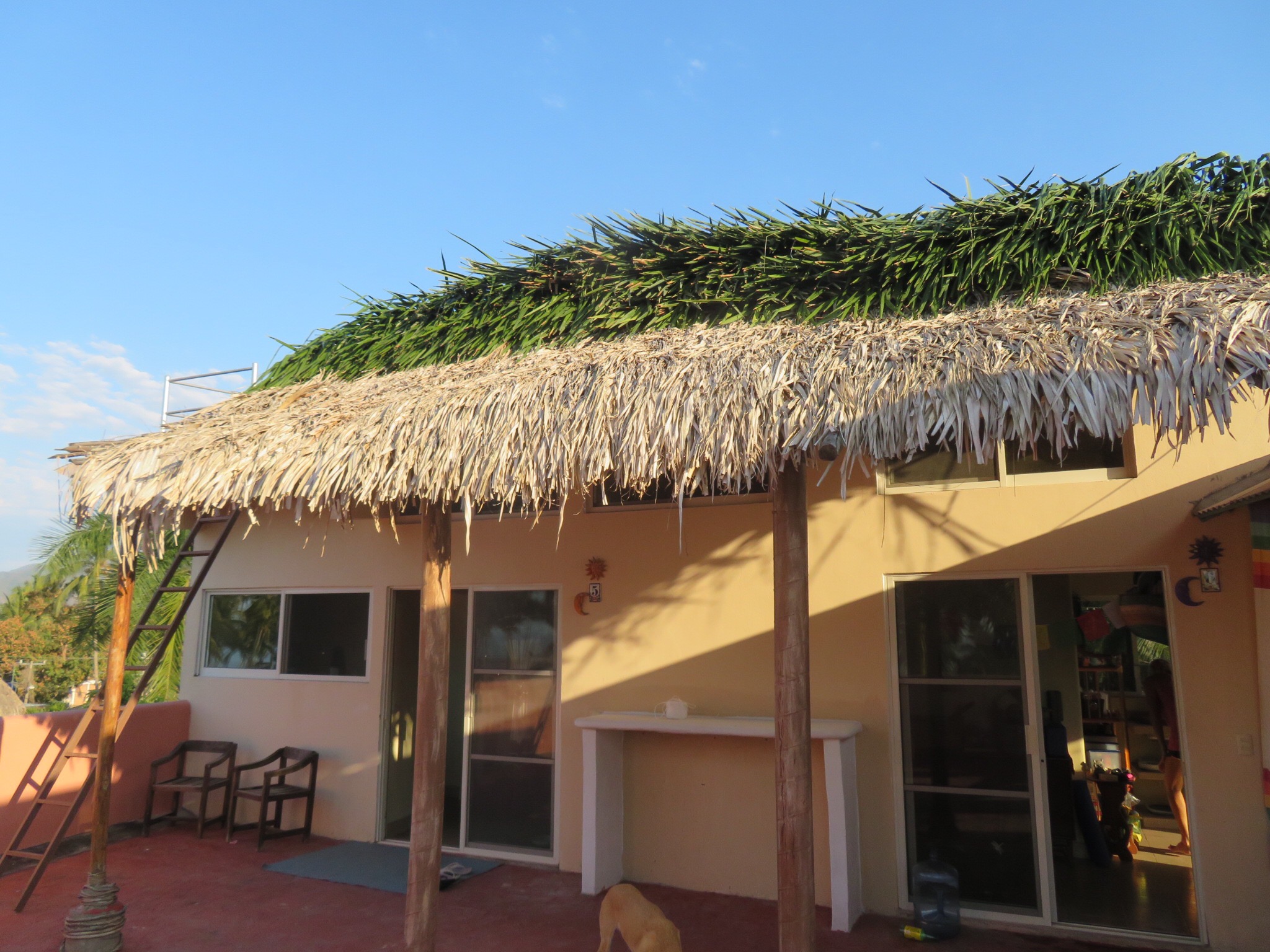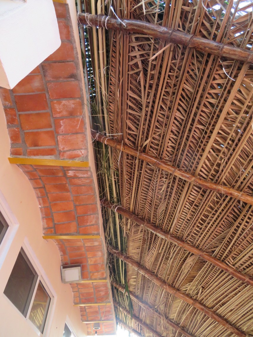 He finished up late in the day running out of material. Tomorrow, Jose Luis will go trim some palms for another customer, then bring more fronds to do a slight return back towards the back of the house creating a peak at the top that flows water off both ways. He’s also promised to bring us some coconuts.