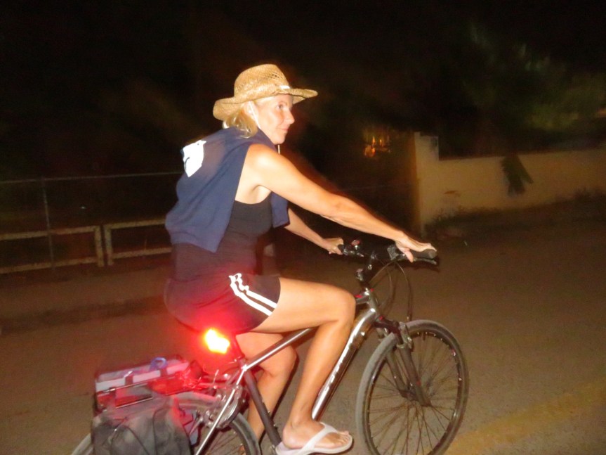 We ate our fill and added in a small additional donation before thanking our hosts and riding the Duosports over to the ice cream shops. There was a spooky looking green liquid swirling around the feet of the plastic chairs that line the street. We got a couple of scoops of ice cream and sat along the road side watching the townsfolk pass by.