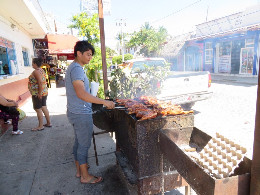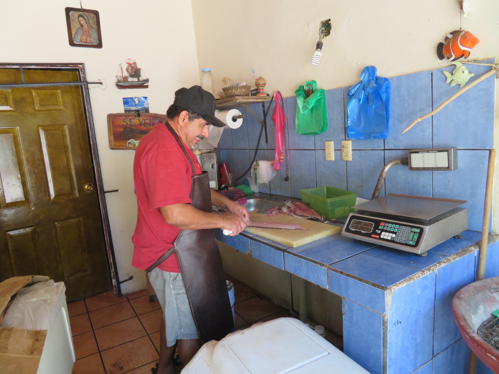 We stowed our supplies in our panniers and rode the bikes around on Calle Zapata to avoid the cobbles and came out at the fish market down past the plaza. Rodrigo’s catch today was a choice of sierra or tuna fresh off the boat. I had him filet me up a couple of sierra and also picked up a half kilo of shrimp.