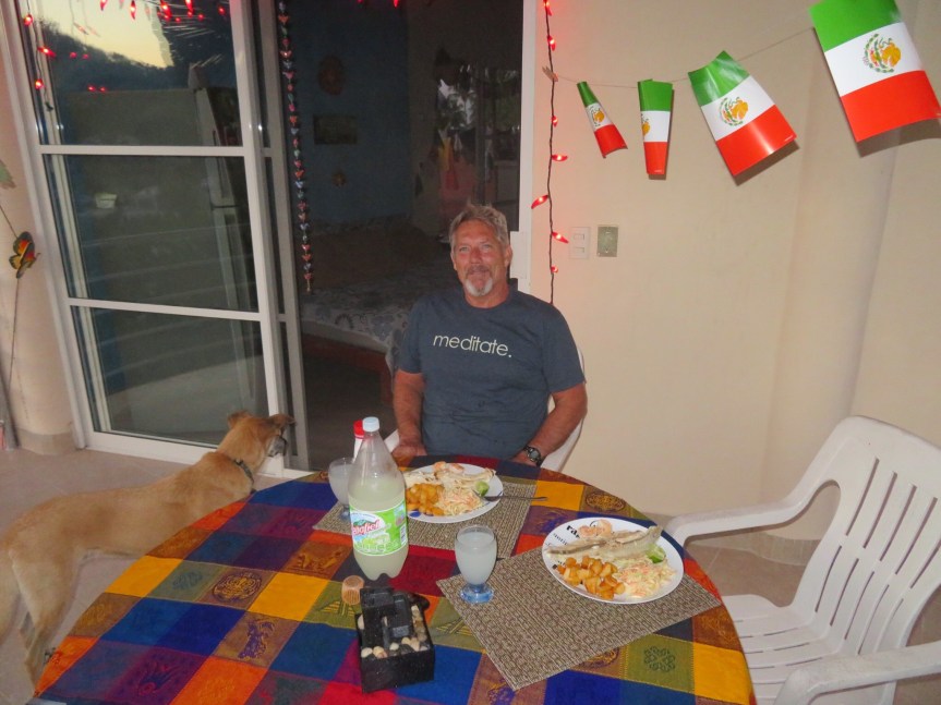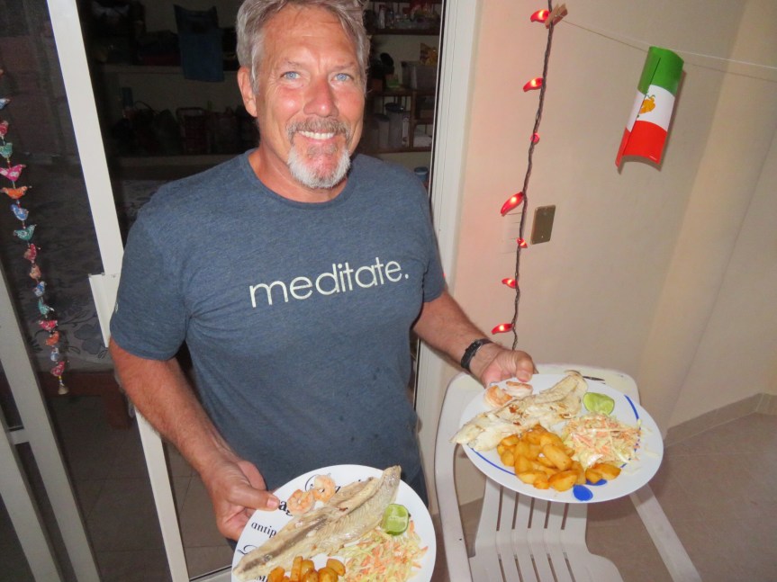 For dinner, I sautéed up the fish in butter and garlic and served it up with potatoes and the cole slaw that came with the chicken. So far, tonight is a total turn around from last night’s raucous noise fest. Pretty quiet with a cool breeze blowing through the palms. Peaceful.