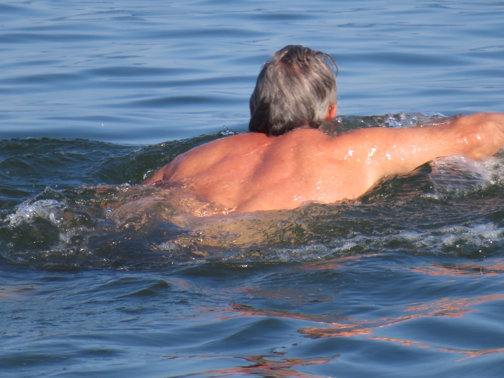 I grabbed my goggles and went for a swim down the beach until I pulled even with Mark and Laura’s house. Then I did a wide looping u-turn and headed back. The current must have been with me on the way back because the return trip was much easier than the first leg of my lap. PJ followed a while on her boogie board and was waiting to intercept me on the way back.