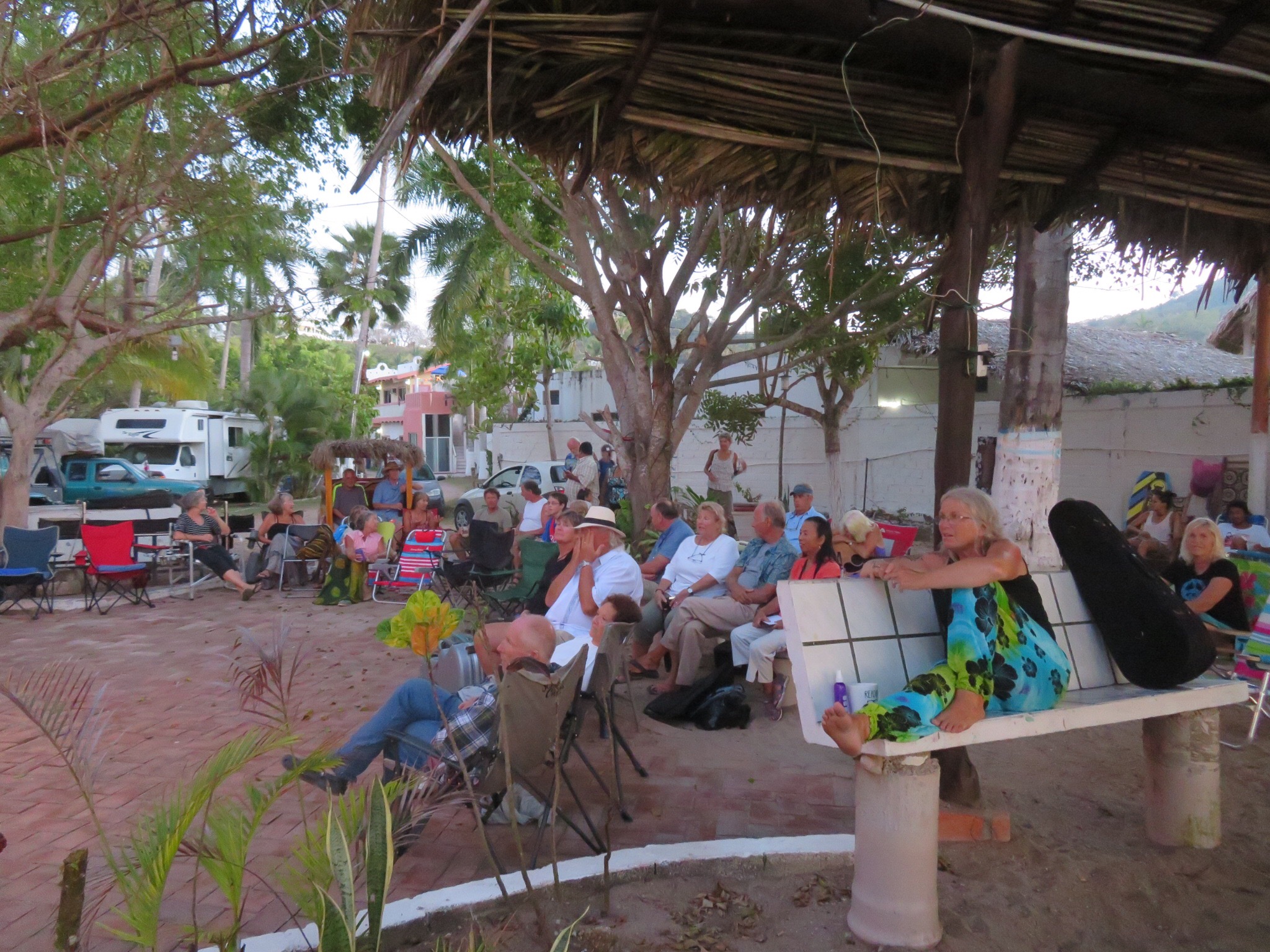 We rinsed off and I sautéed up the shrimp I bought from Rodrigo yesterday. Garlic, mushrooms and butter. Served them up with white rice, slice tomatos and avocado. We ate on the sky deck while watching people arriving for tonight’s final open mike session of the season. I thought last week’s hootenanny was the final hurrah, but Miguel has added this one more.