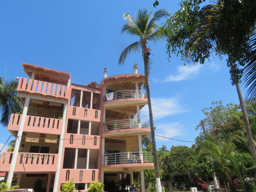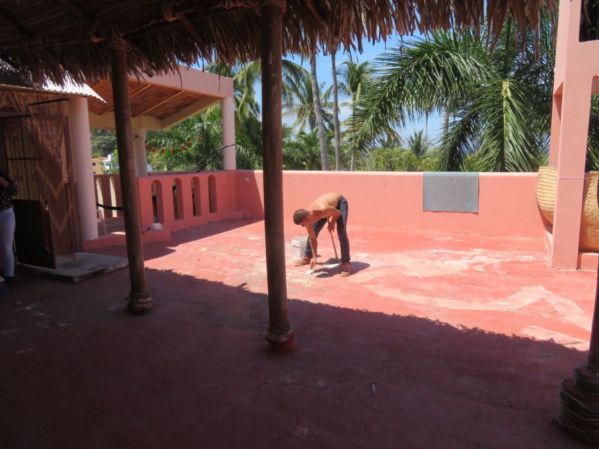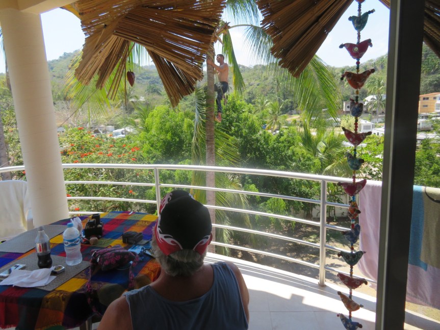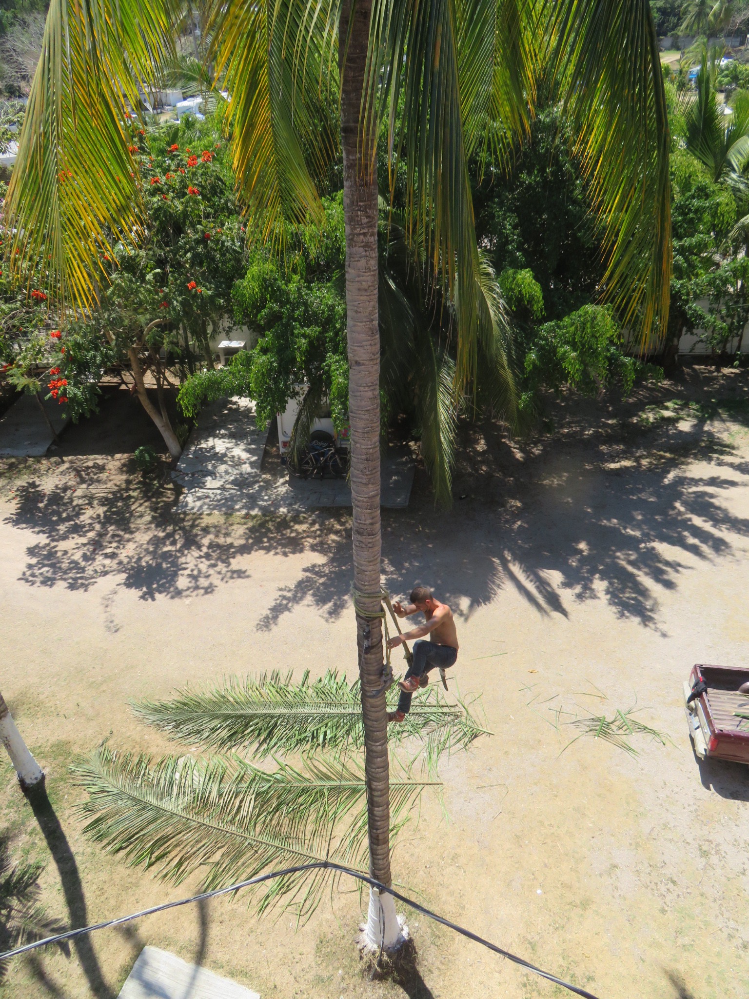 Back at the casita, Jose Luis had finished thatching the roof and had started in scraping off the deck to prepare it for a new coat of sealing paint. I called the Comex store but the paint they claimed would come in today wasn’t there yet. Jose Luis then started in grooming Miguel’s palm trees for him. With a couple of sections of rope, he would shimmy catlike up the tall palms and cut off the ailing fronds and any coconuts that might end up being a hazard later on.