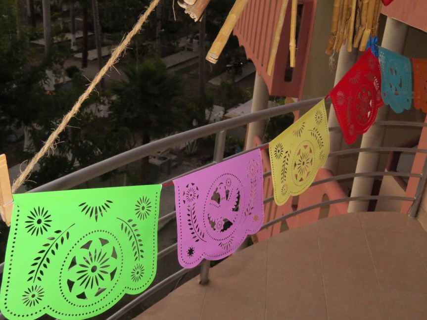 Inspired by those braver than I who took their seat at the open mike last night, I busted out the guitar and worked on a couple of songs I’ve been trying to tighten up. I had my song sheets all spread across the bed and was banging away on the guitar when Jose Luis, the palapa guy showed up to finish the job. He had pulled up in his truck with a load of palm fronds in the back and was ready to get working. We spoke briefly then he got busy finishing the work while I went over to the Cruz Maria RV park next door to get some fishing tips from my friend Bob.