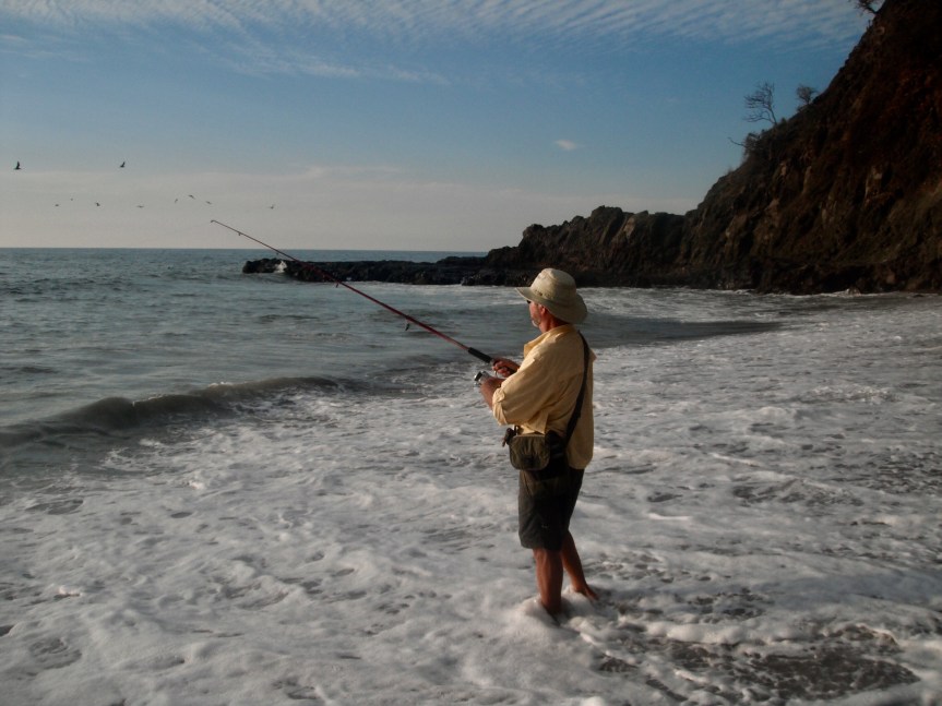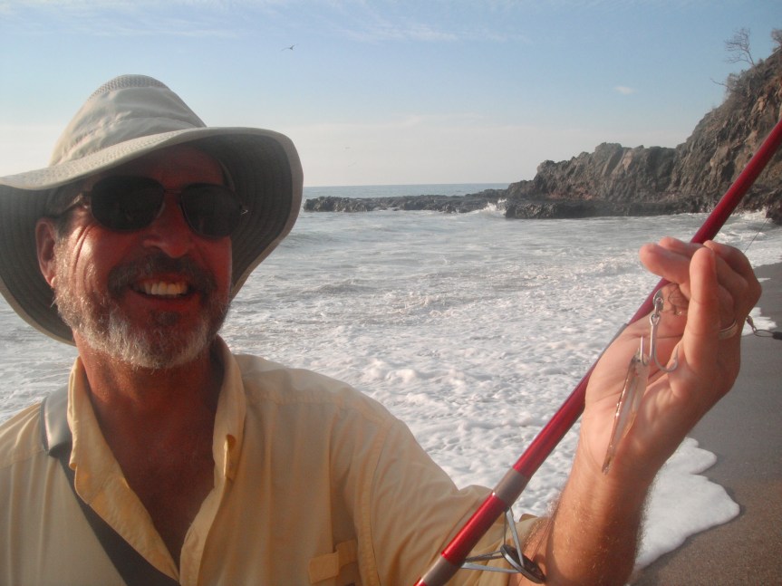 When I got down to Olivia’s, Bob was no where to be seen. Way down at the north end I could barely see a guy in a yellow shirt and I guessed it was him so I trudged on down the beach in that direction. I walked past the lagoon and caught up with Bob near the point. We worked our way down the beach casting our lures and hoping for a fish. I practiced my casting technique and got much better as I figured a few things out. The shore break was pounding and I got rinsed a few times when I wasn’t paying close enough attention.