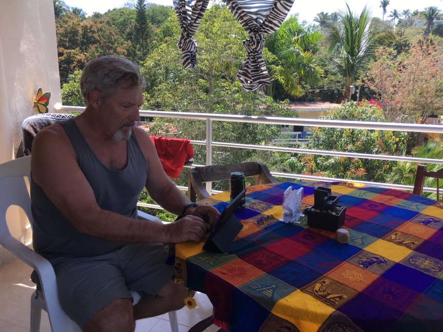 I sat out on the sky deck watching the circle spin as the house internet ever so slowly uploaded photos from yesterday. I finally got a post I was happy with in the early afternoon and cleaned up a couple of older posts. I played guitar a little bit and when Miguel was releasing his frustrations on his drum set, I grabbed my djembe and pounded back an answer on my little drum. Mari came to clean the houses so we dodged around from room to room to let her do her thing.