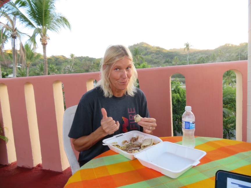 In the late afternoon, I went over to Alzarohi, the beach restaurant out front and ordered fish filets to go. As they were cooking, I jumped in the water and body surfed some shallow beach break slammers. Tranquil evening eating our to go meals out on the deck watching the sun paint the sky.