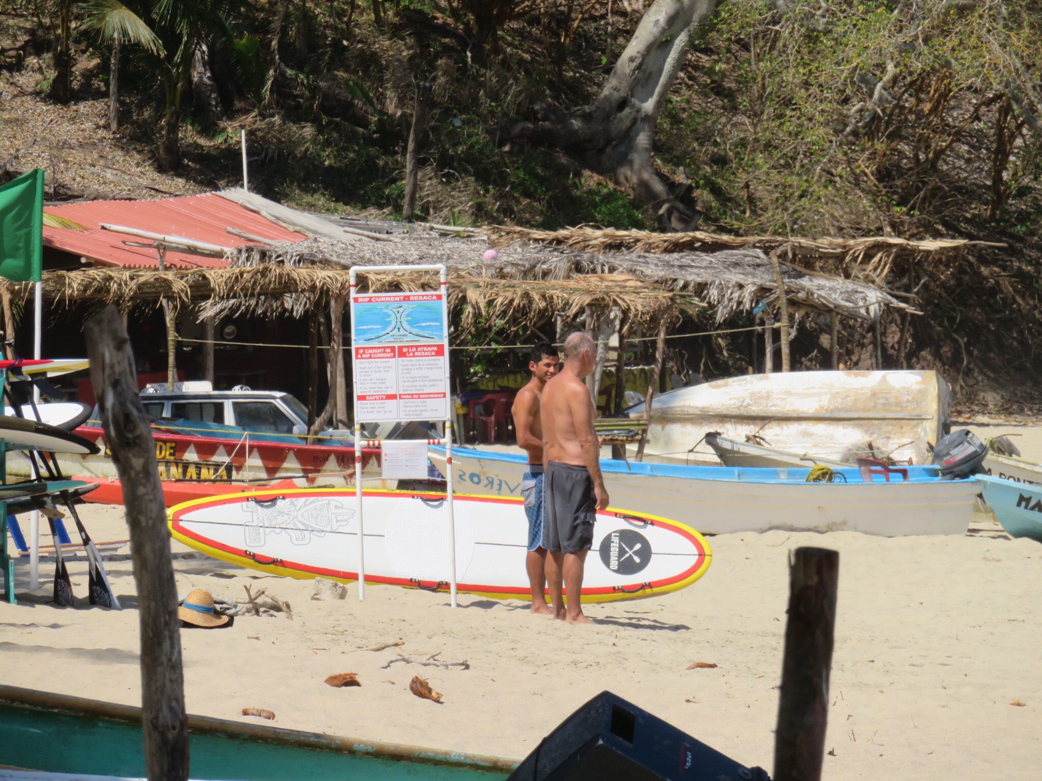 PJ caught about three decent waves that pushed her for fair ways. Mostly laying down, but she nearly got to her feet on one of the better ones. After about 45 minutes, she was getting fatigued so we went in to shore. Tom was paddling out so I decided to join him. Grabbed my board and we caught some o.k. little mush burgers at the point. I met Oliver, the kid who rents SUPs in front of Tomatina’s and got his info for pursuing that further when the ocean is calm. He had taken a group of tourists out paddle boarding around the end of the headland. They all came paddling through the line up trying to catch a wave with limited success.