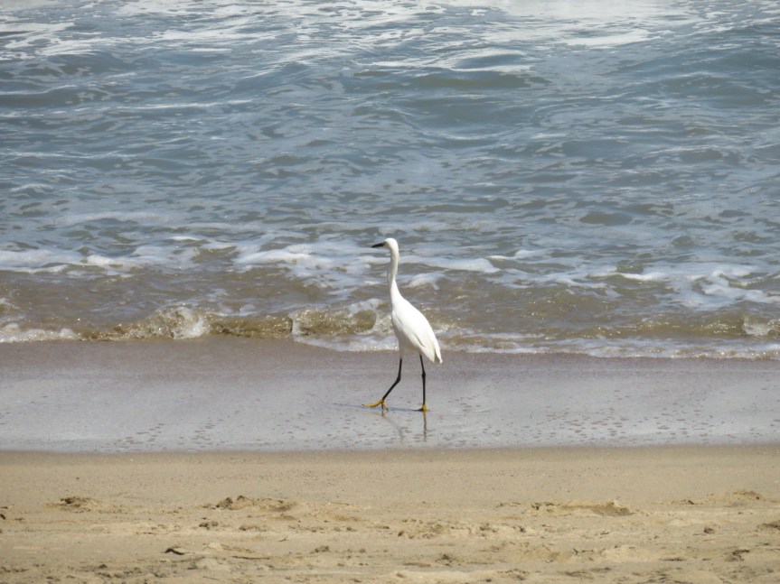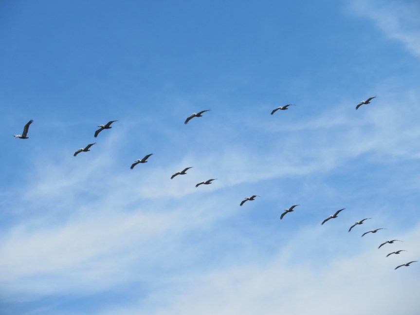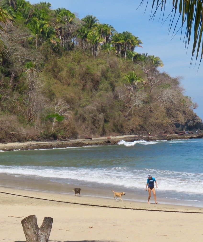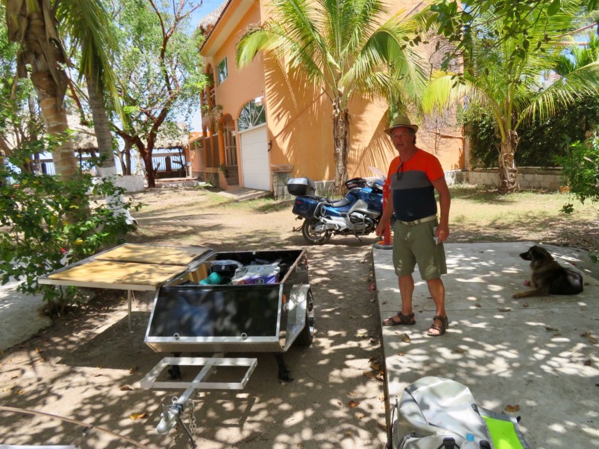 I went in and sat around by the gate drying off. Large squadrons of pelicans flowed from north to south in big vee formations catching an updraft from the tall trees on the point and then disappearing around the corner. Kara came down to surf and we talked for a few minutes. Ward came out to have a look at the beach and joined the conversation. He drove down from Canada on a motorcycle pulling a trailer. He’s been coming and going since arriving about three weeks ago leaving the trailer here so he can travel around Mexico unencumbered.