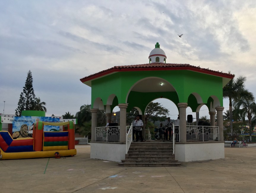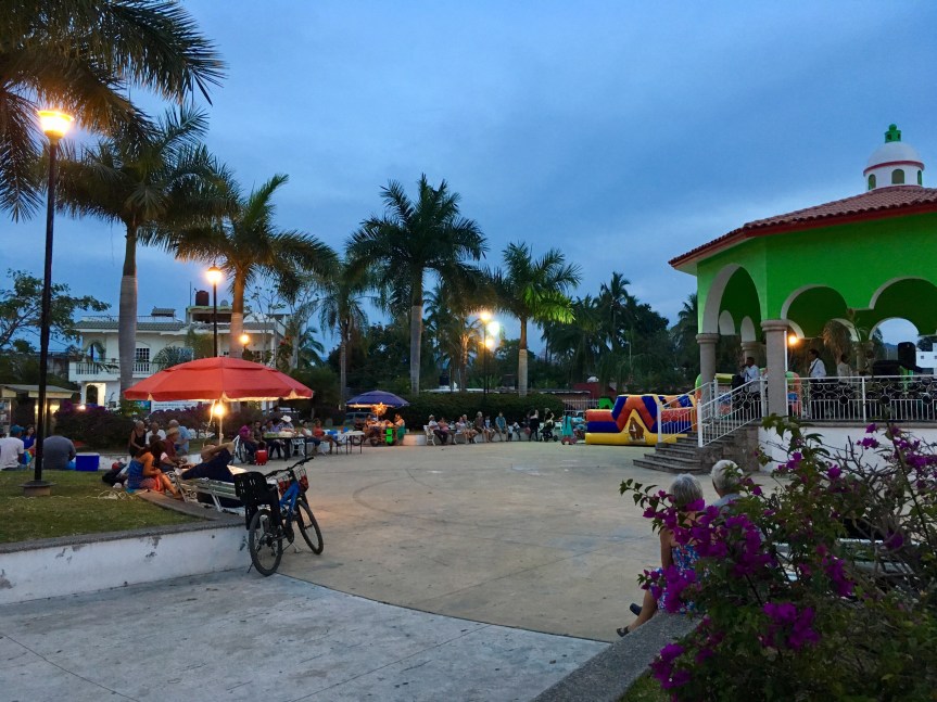 On Wednesdays, there is music in the square and vendors set up carts with all kinds of food around the plaza. The band was warming up on the stage as we ordered up a quesadilla for PJ and some tacos for me. Freshly pressed and heated tortillas with a nice spread of salsas and sides. We joined a Mexican family at the table and watched the scene unfold. Kids jumping around on the inflatable fun houses, teenagers flirting and once the music starts, o.d gringos dancing.