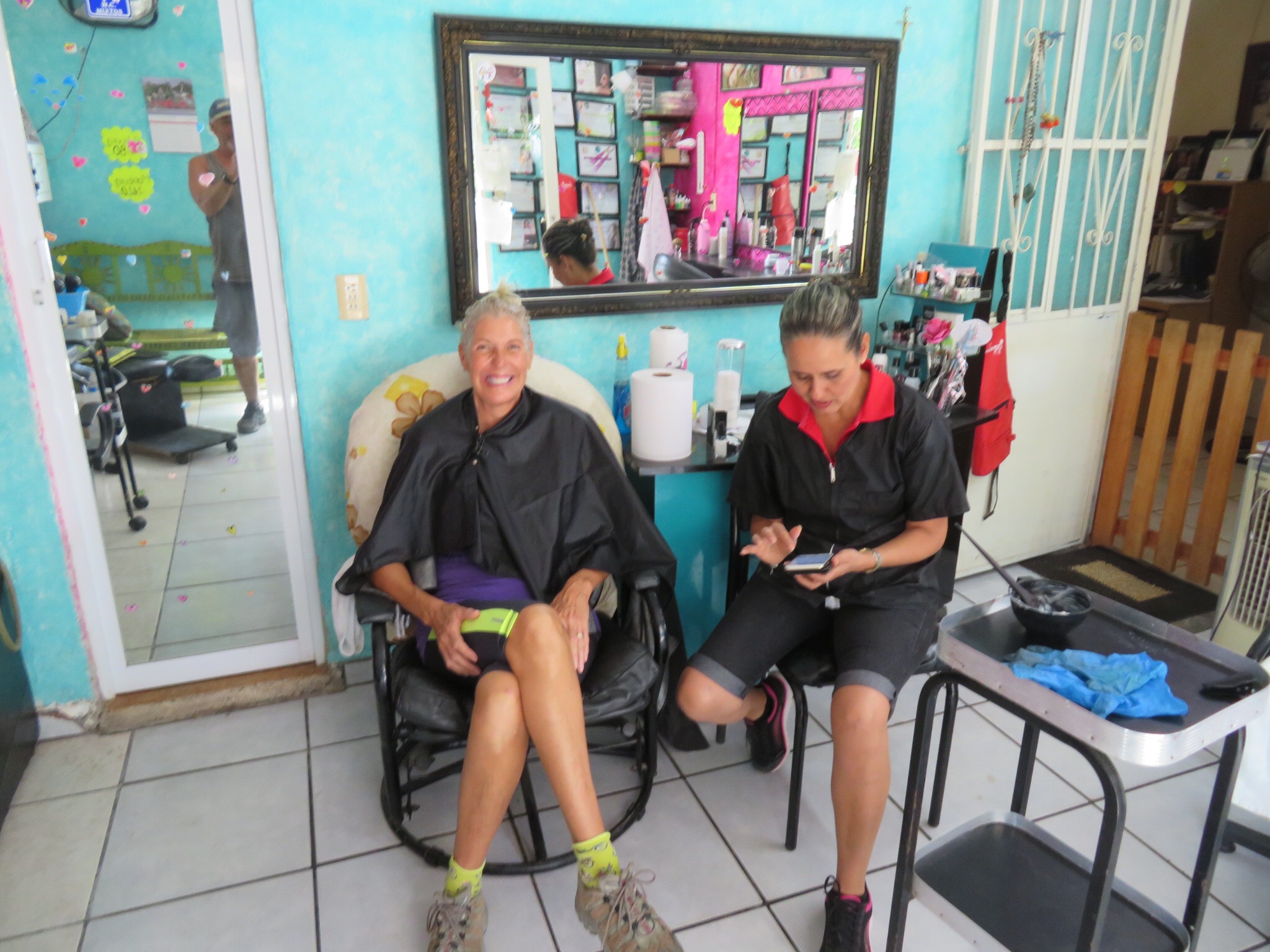 Janett got the tint worked into PJ’s hair then we sat around sharing photos and stories. We were treated like family and learned a lot about the town. Janett has an easy smile and her upbeat outlook is contagious. Her husband is the mayor of Lo de Marcos. We met him briefly as he was passing through the shop going about his business. We also learned that Lety over at Bernal’s market is her sister and that today is her birthday. The timer went off and PJ got rinsed and ready to go. Her hair looks great. 5 stars for Estetica Janett!