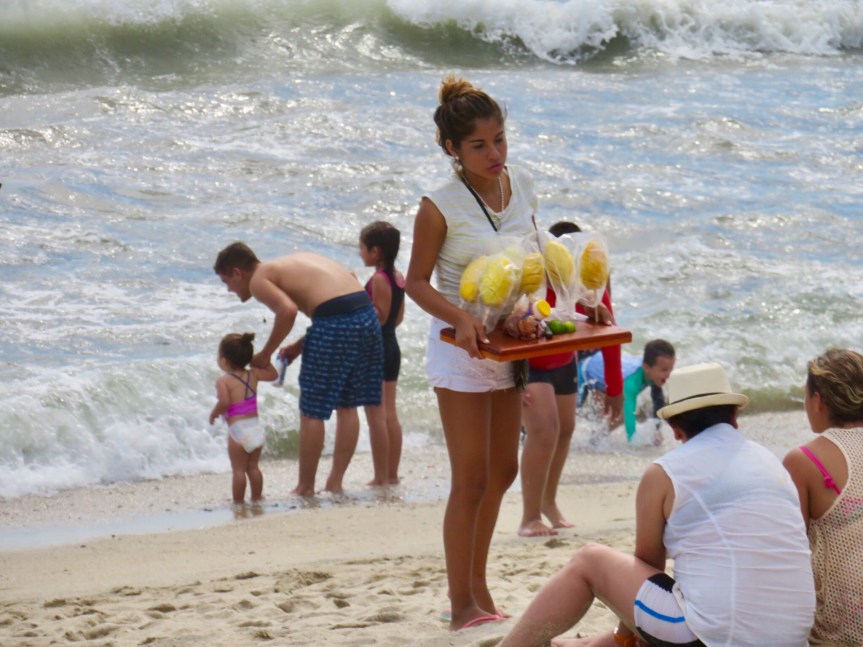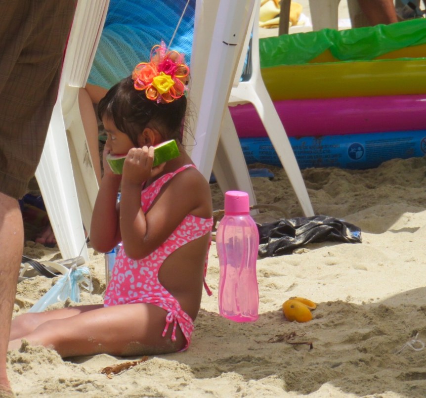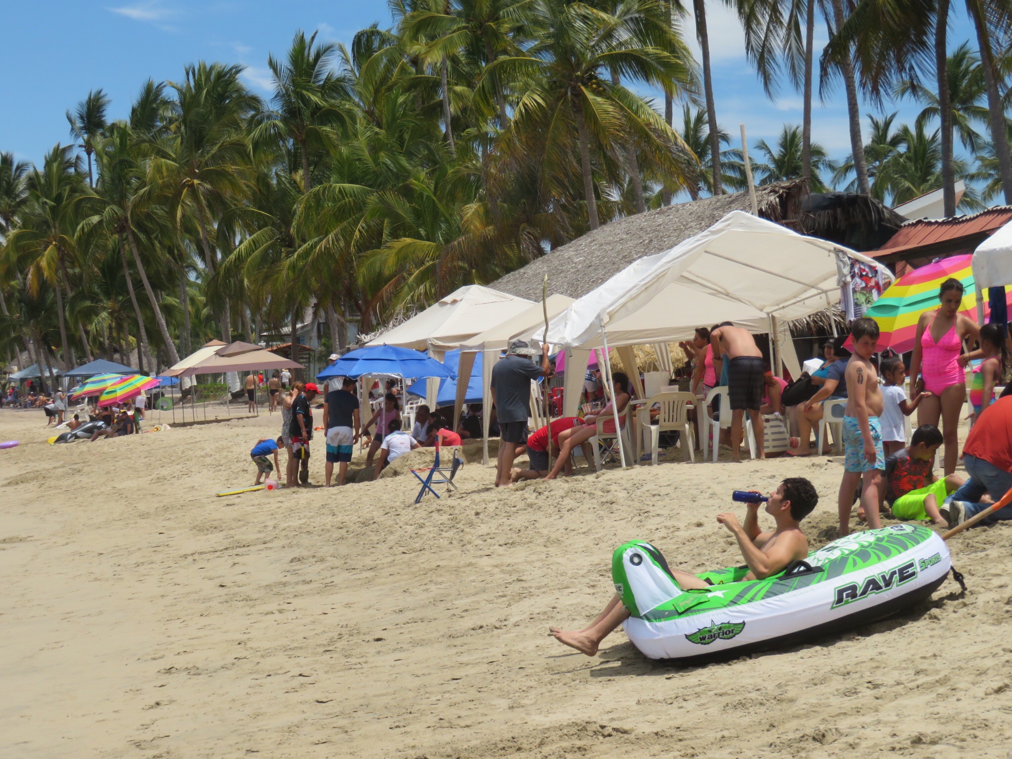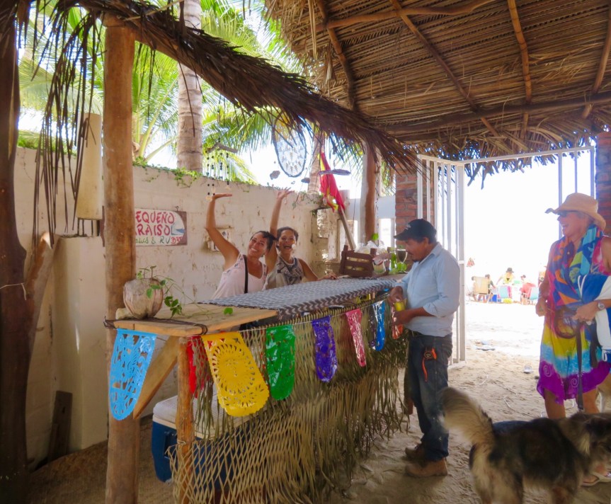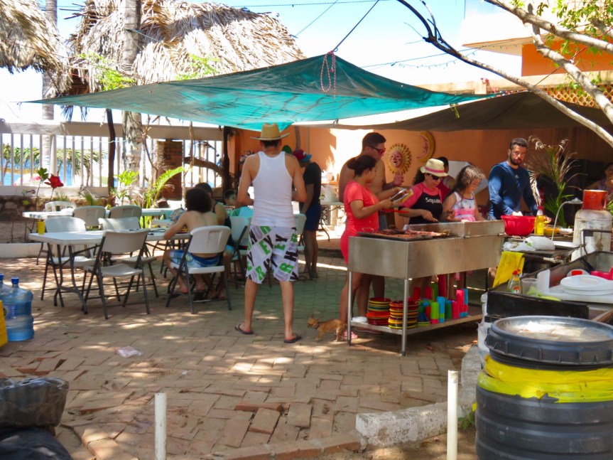 We headed over to Bernal’s to pick up some dog food and wished Lety a feliz cumpleanos. If she was surprised we knew that it was her birthday, she didn’t let on. She has an outgoing sense of humor and a quick wit. I filled a bag with the fresh carnitas that the store had cooked up in a big vat out front. Then I noticed that Samuel was cooking up chickens on the bar-b-que next door, so I went over and bought a hot off the grill bird with all of the fixins – rice, salad, salsa and a stack of freshly pressed and cooked tortillas for 120 pesos. We pedaled our way back to El Pequeno Paraiso and I ate chicken and carnitas tacos while watching all of the vacationers enjoying their day at the beach.