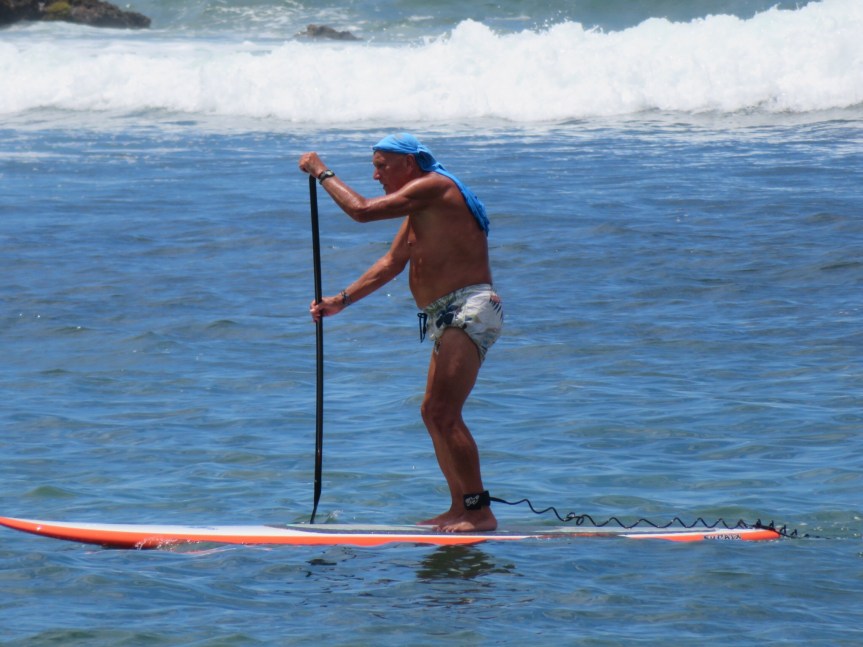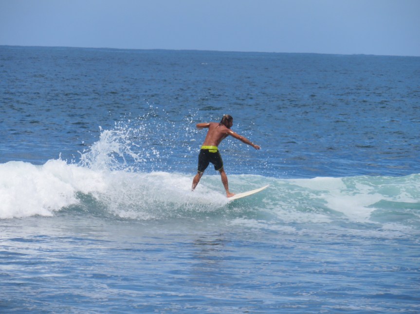 It was hard getting to the water as people had erected an unbroken line of tents and overhangs neglecting to allow any space between for an average Joe like myself to make his way onto the beach. We walked through some people’s zone and hit the water. PJ took the dogs for a walk out to the point and I strapped on my goggles and went for a swim. There were some jet skis ripping around to the right so I swam straight out to the anchored boats then swam out to the rocks at the end of the point. Some decent little waves were pushing through and a few local kids were making the best of them.